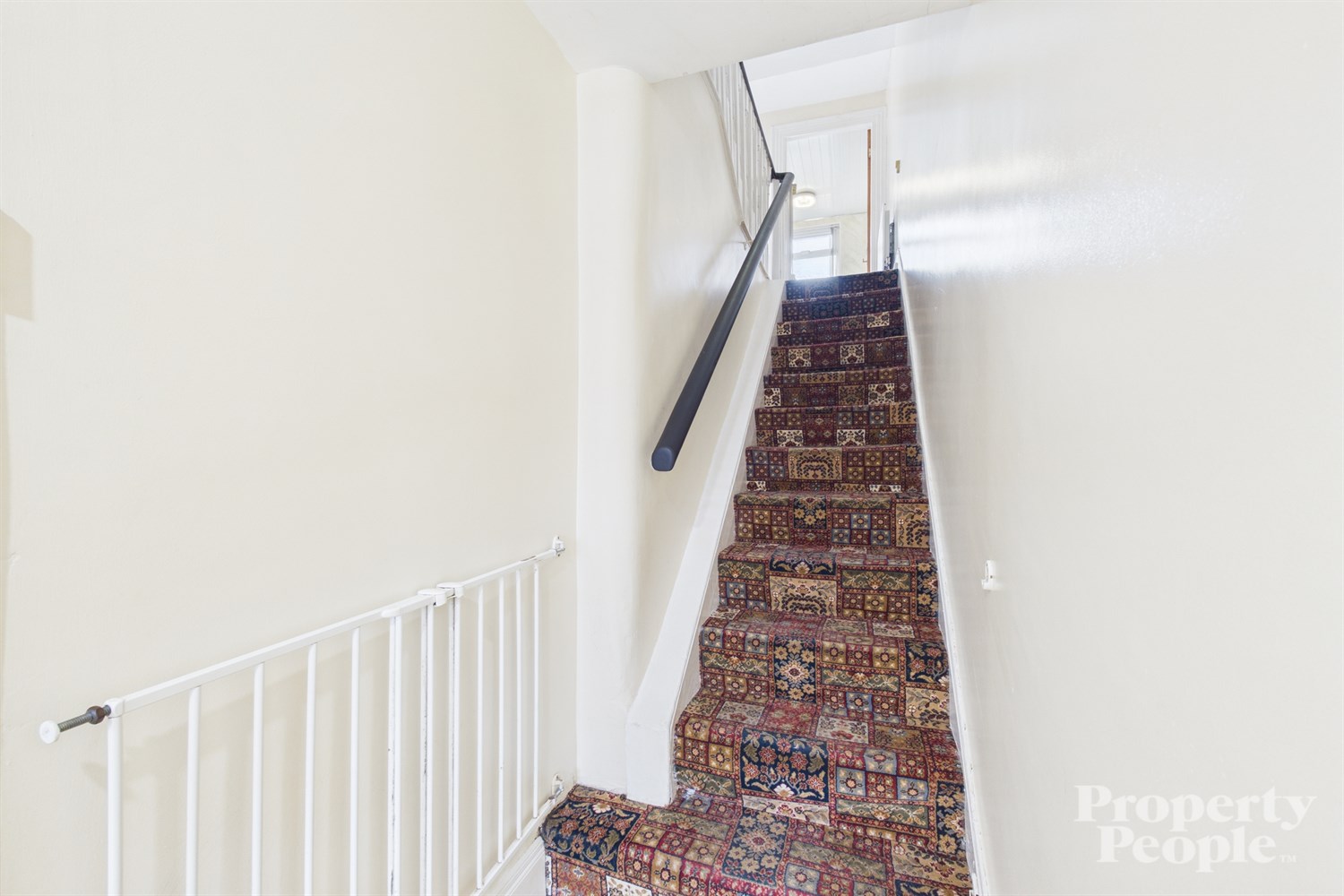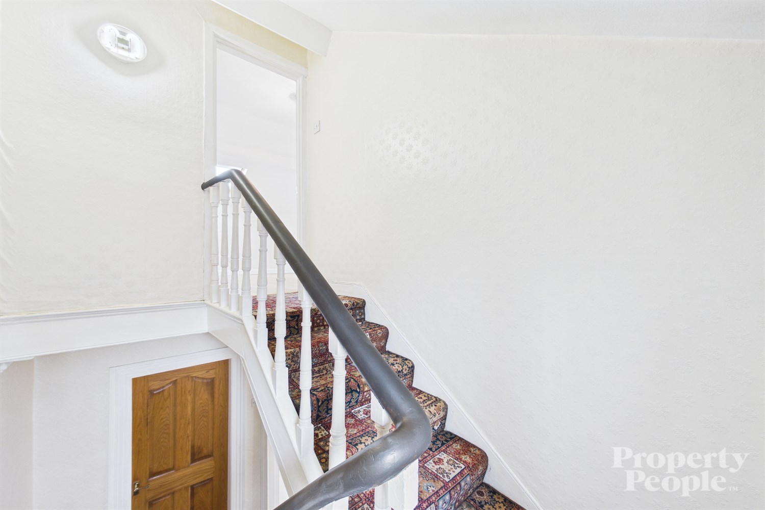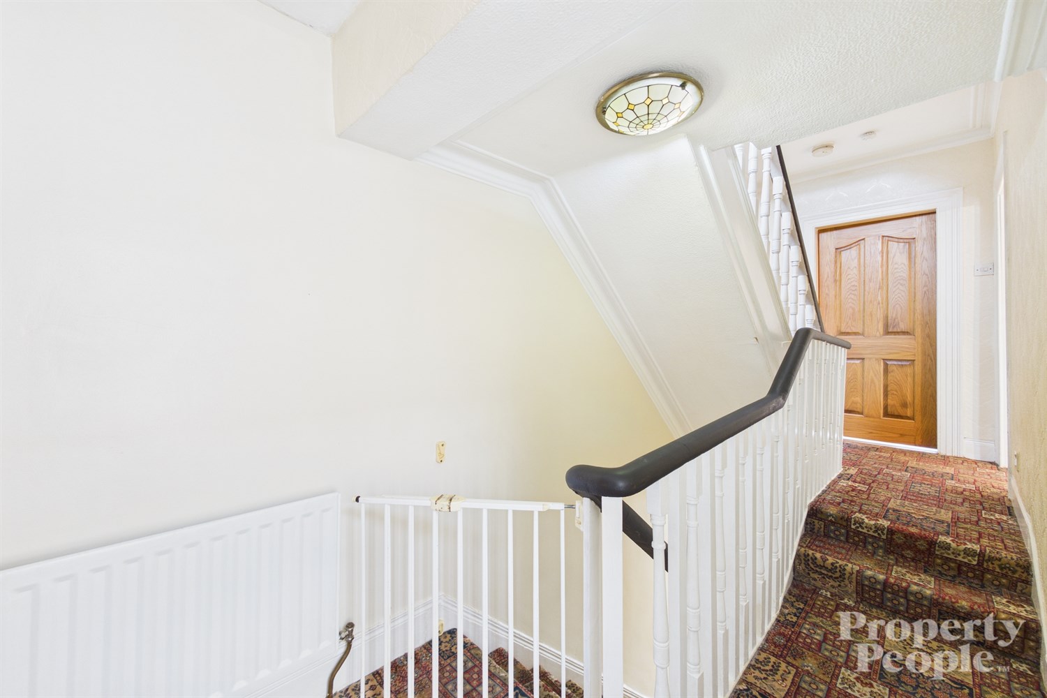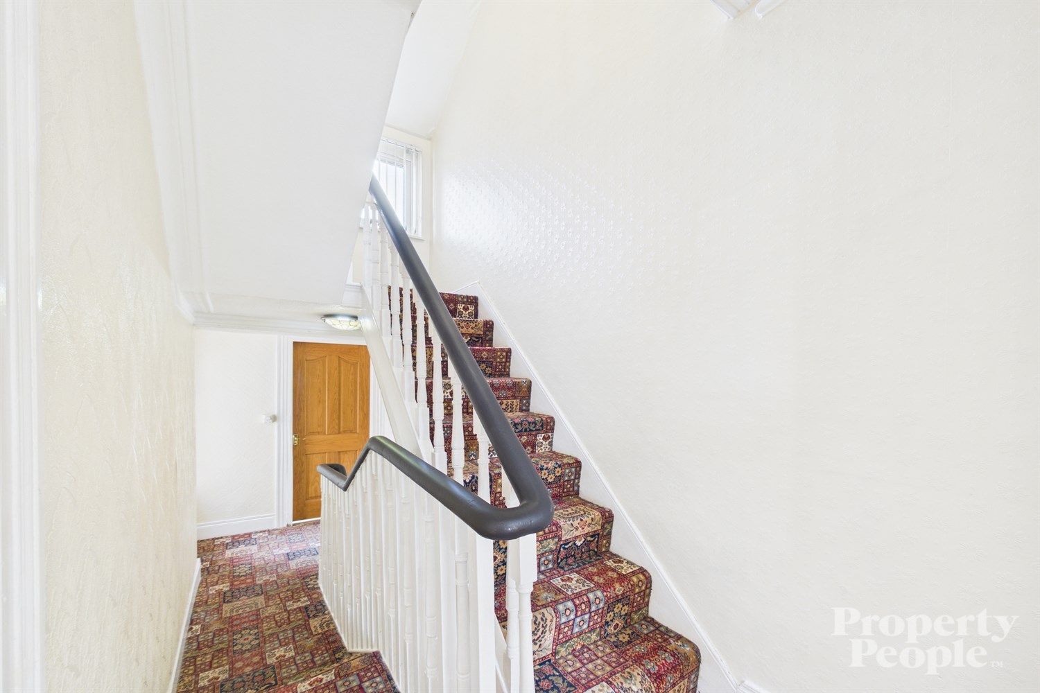 Carpeted stairs to 1st floor landing providing access to upper rooms ...