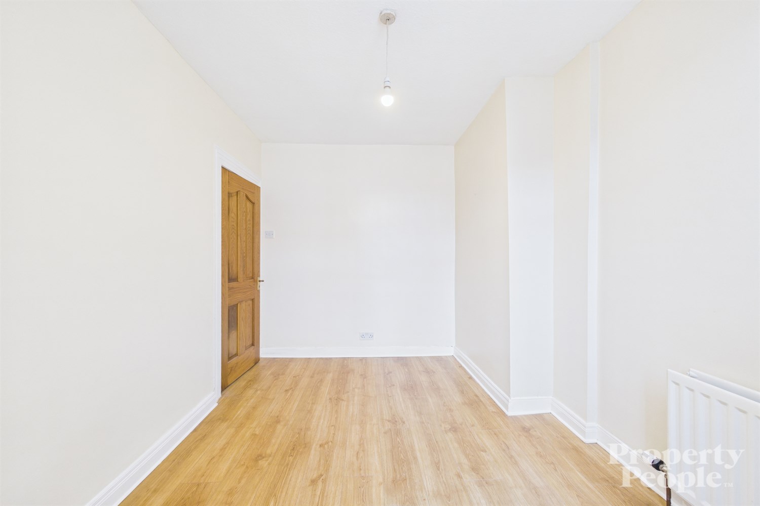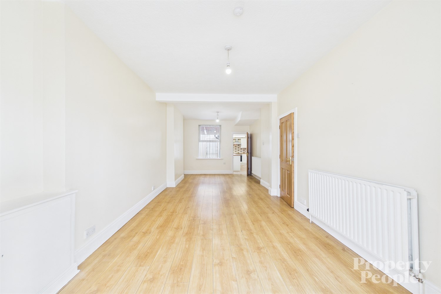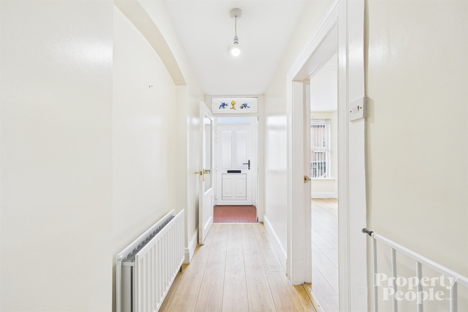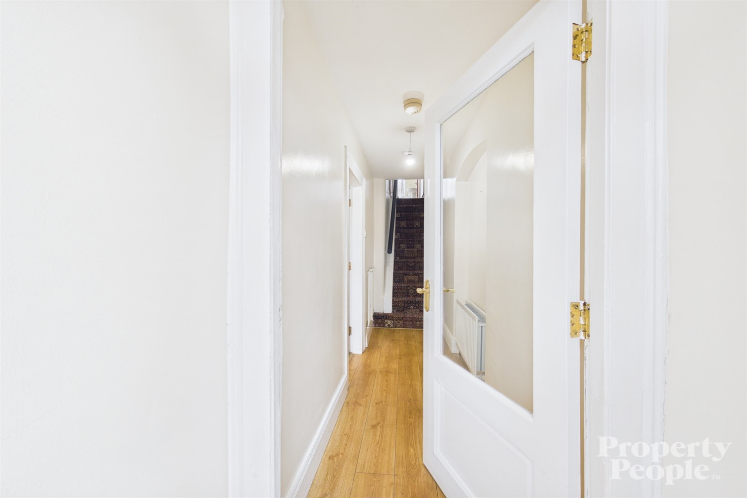 Welcoming entrance hallway with laminated wooden floor and double panel radiator.