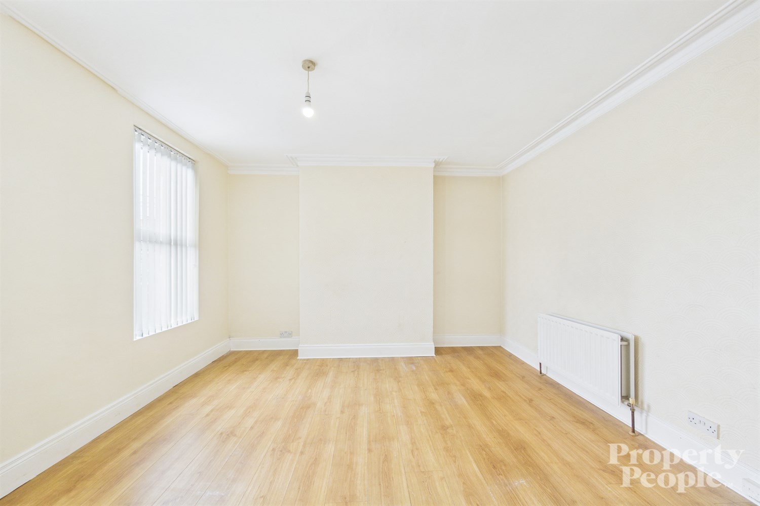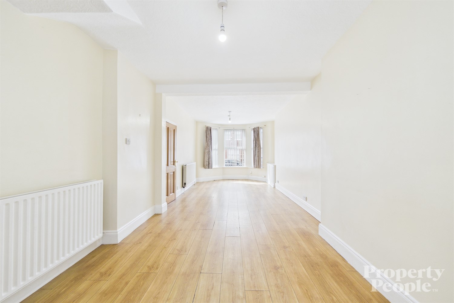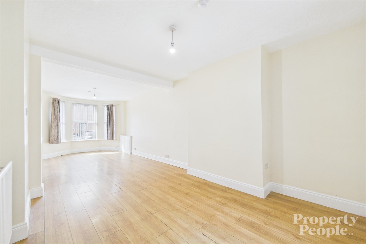A bright and spacious open plan living and dining area, perfectly suited for entertaining family and friends. The room features high ceilings and a bay window that floods the space with natural light, creating a warm and inviting atmosphere. The layout offers a seamless flow complemented by laminate wood flooring and a double panel radiator for added comfort. The space leads effortlessly through to the kitchen, enhancing its practicality and appeal.