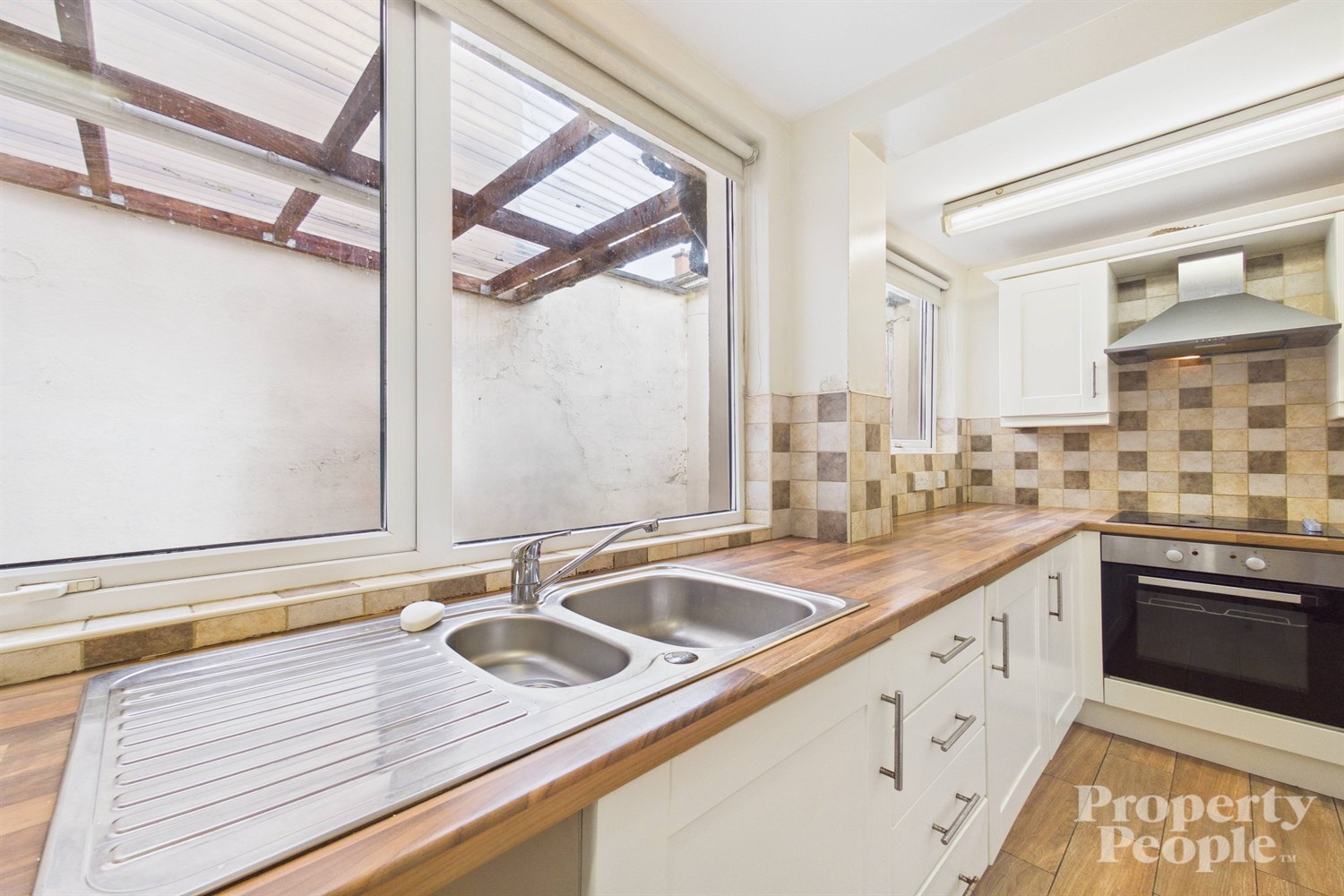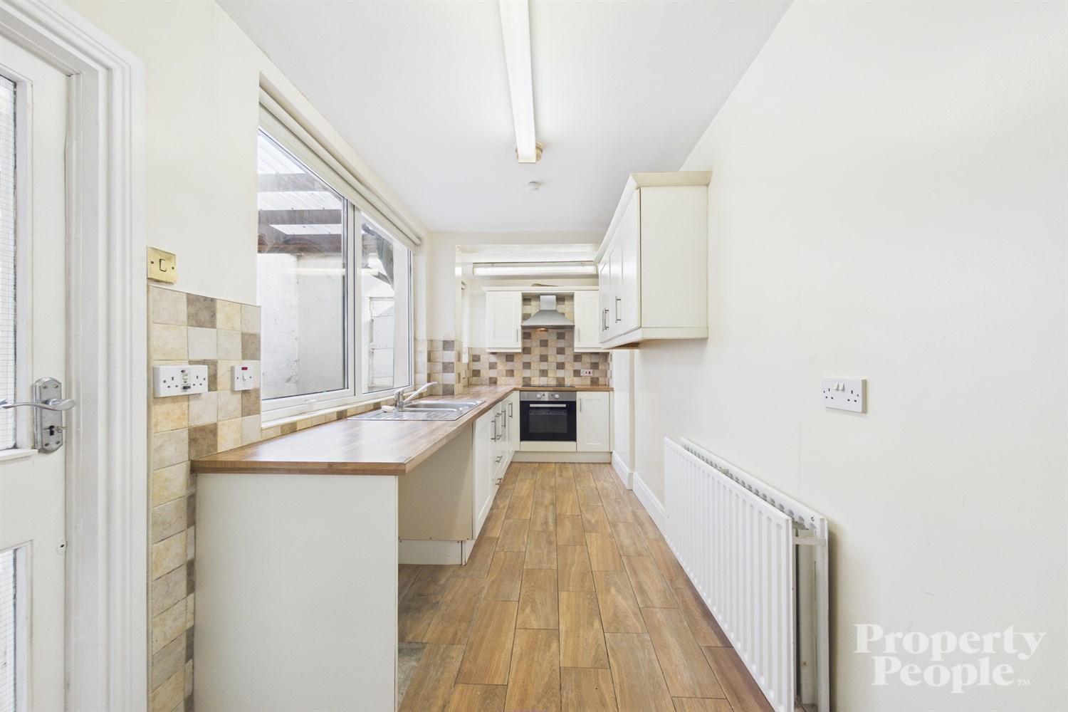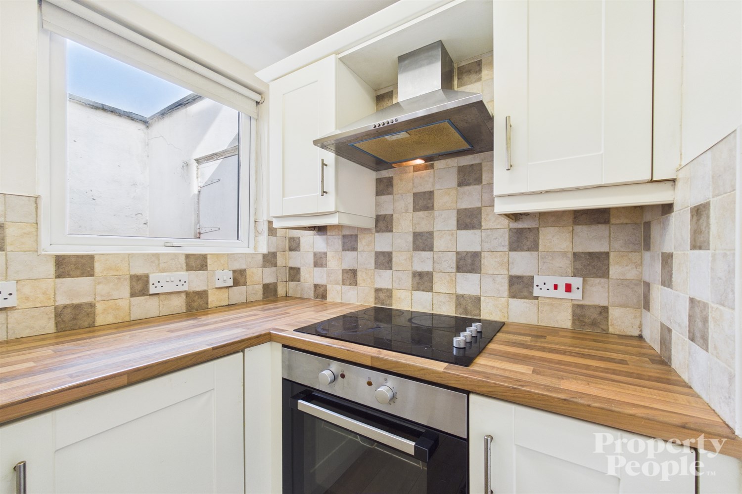 A modern fitted shaker-style kitchen featuring a range of high and low-level units, offering ample storage and workspace. The worktop is complemented by partially tiled walls, a stainless steel sink, mixer tap and drainer. Integrated appliances include a four-ring electric hob and electric oven, with a stainless steel extractor fan overhead. There is also space for a freestanding fridge freezer, along with plumbing for a washing machine, making the kitchen both practical and functional. Access to rear yard.