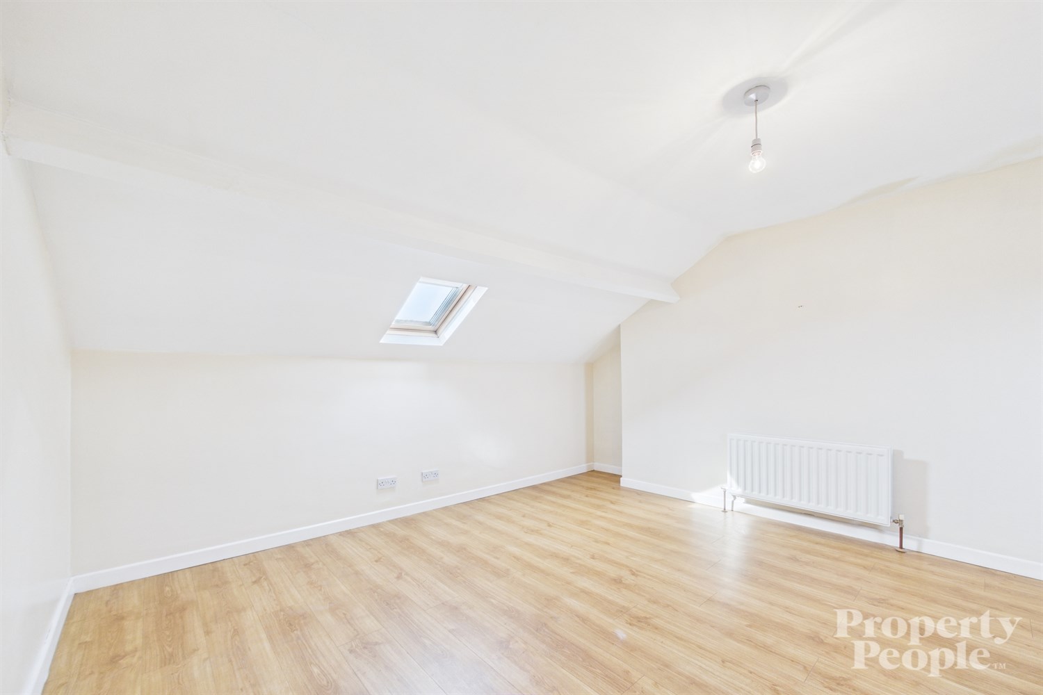 A bright and spacious top floor bedroom featuring velux windows that fill the room with natural light. The space benefits from useful under-eaves storage, laminate wood flooring and a double panel radiator.