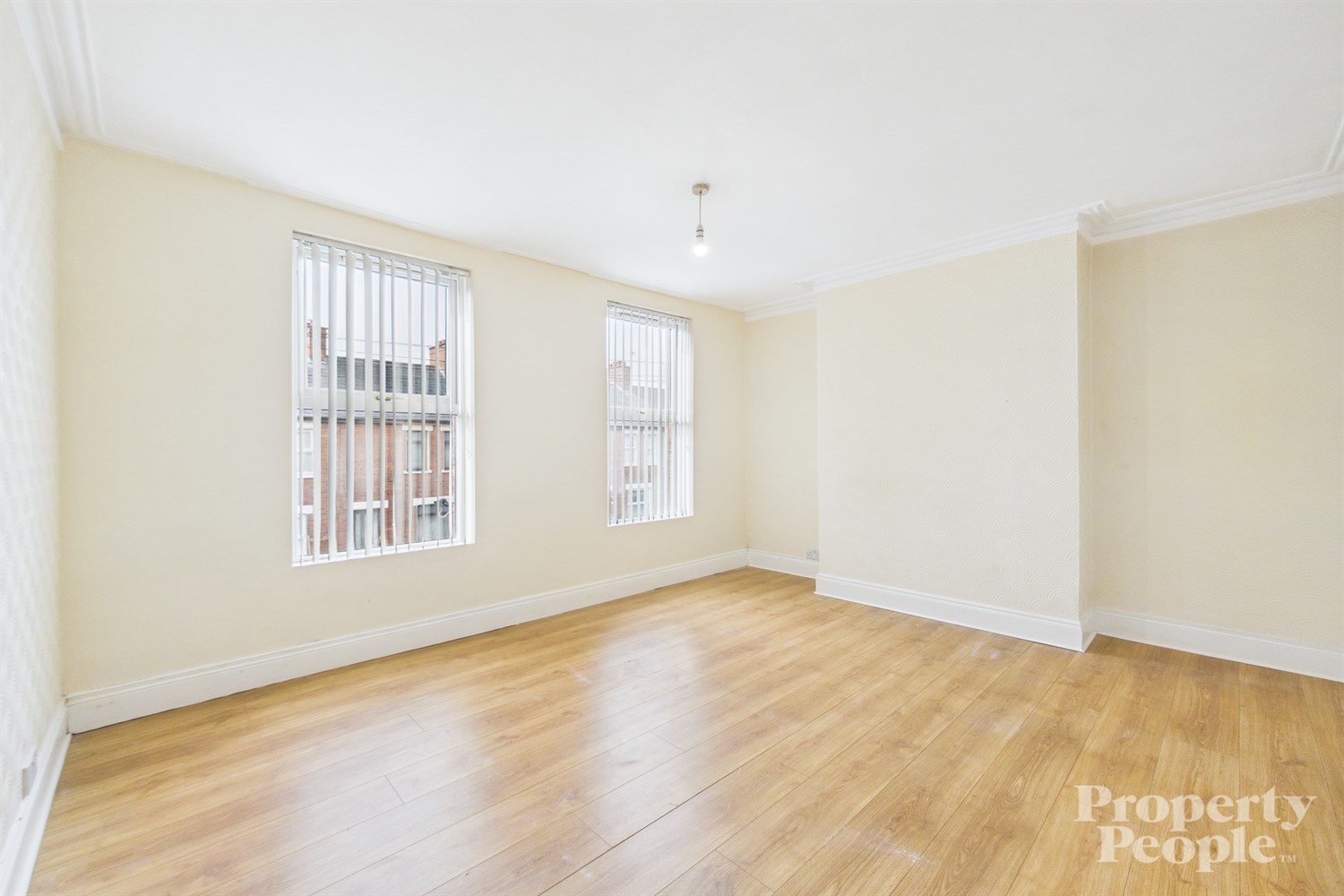 A bright and spacious double bedroom with a front-facing aspect, featuring large windows that allow for an abundance of natural light. The room benefits from high ceilings with decorative cornicing, complemented by laminate wood flooring and a double panel radiator.
