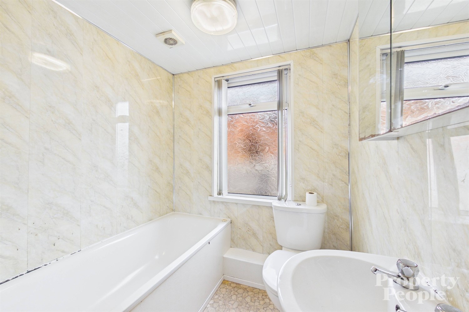 A fully panelled three-piece family bathroom suite comprising a pedestal wash hand basin, low flush WC and a bath with mains shower overhead. The room is finished with lino flooring and a single panel radiator.
