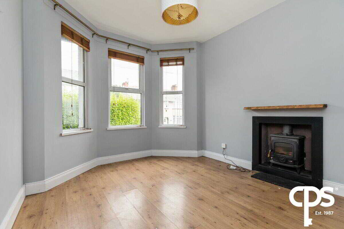 Spacious living room with a feature bay window allowing natural light to fill the space, finished with stylish wood-effect flooring and a wood-burning stove.