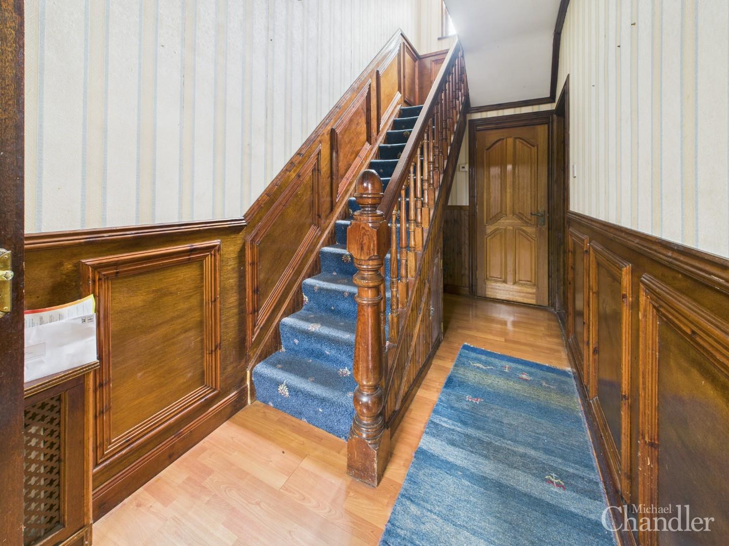 Impressive entrance hall with a wood strip floor and decorative wall panelling