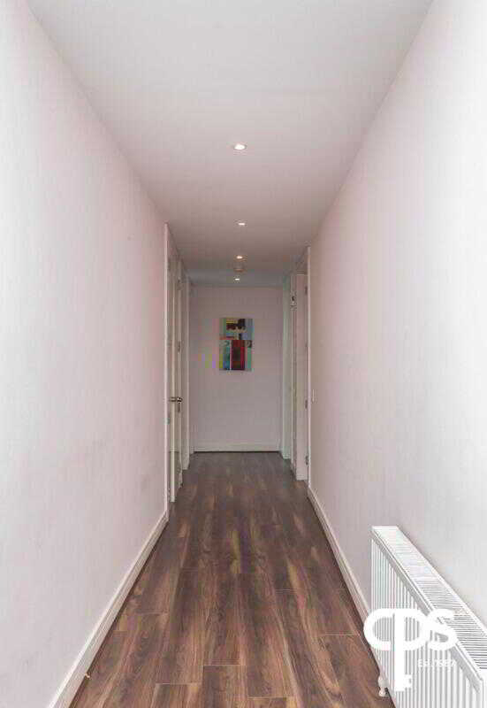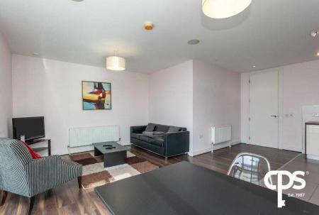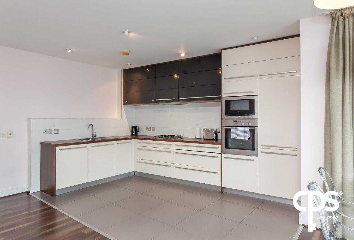 Open plan kitchen / living with laminate flooring meeting the tile floored kitchen. The room has neutral décor and provides outdoor space in the form of a wrap round balcony looking over the famous Titanic shipyard. The kitchen itself is fully fitted with units high and low, built in fridge freezer, dishwasher, oven and 4 ring gas hob.