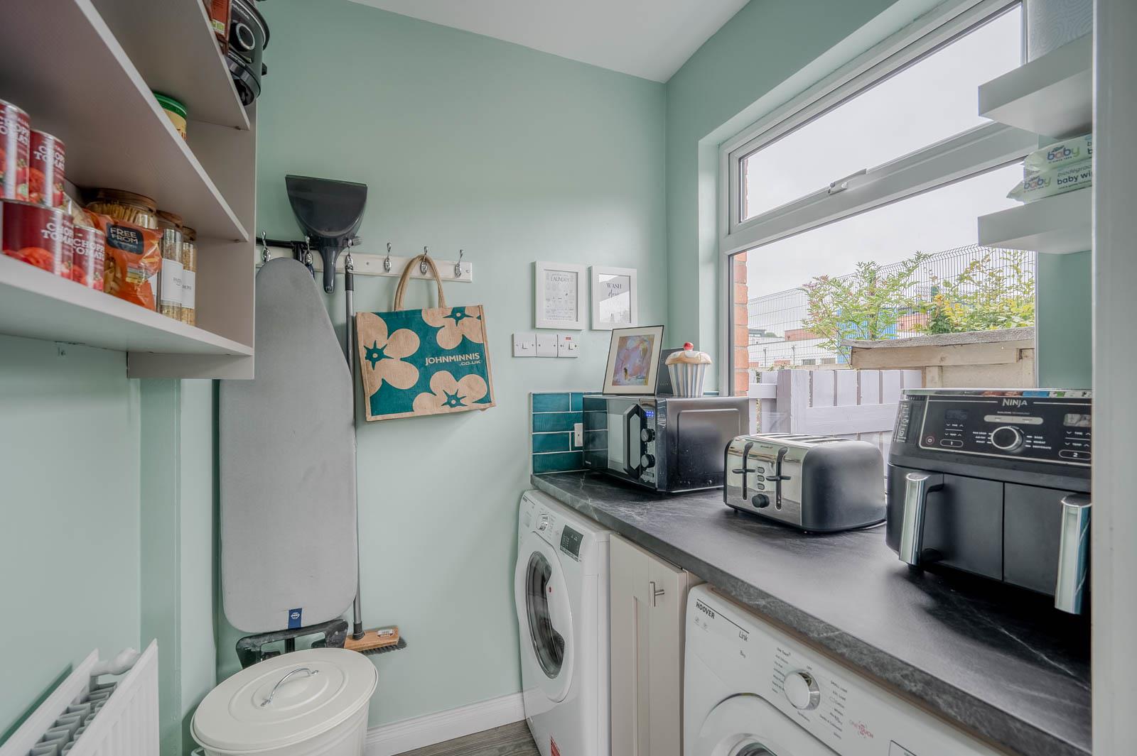 Utility - 5'9 x 5'7 - Laminate worktop, tumble dryer space, plumbed for washing machine, pantry style shelving, wood effect tiled flooring, part tiled walls.