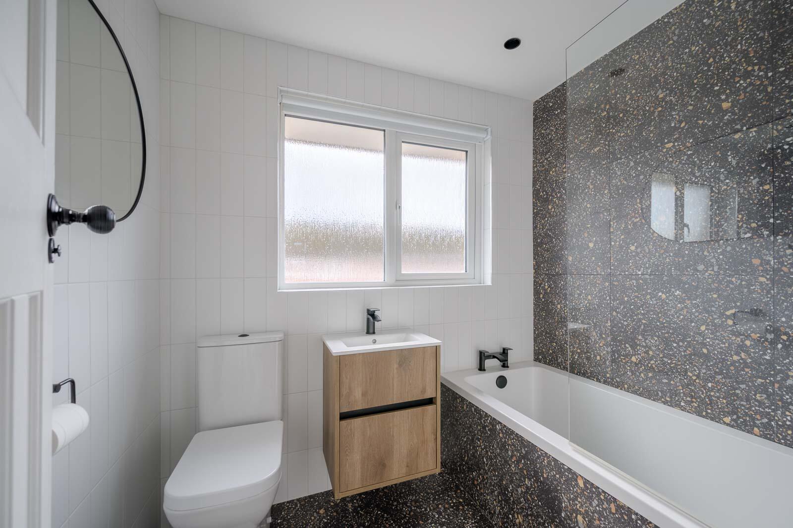 Family Bathroom: - Modern white suite comprising low flush WC with push button, vanity unit with matt black mixer tap, tiled panelled bath with matt black mixer tap, thermostatically controlled valve, telephone hand unit and overhead shower, fully tiled walls, porcelain tiled floor, matt black heated towel rail, low voltage recessed spotlighting, frosted glass window.