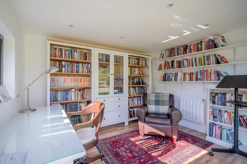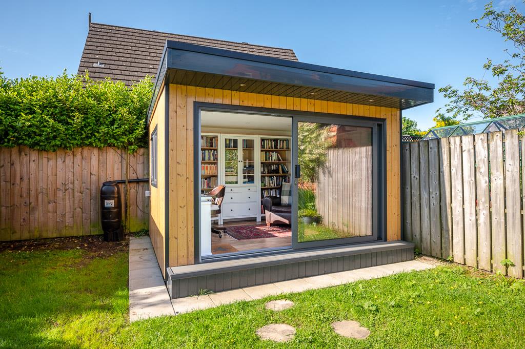 Home Office Pod: - () - Insulated, light and power and electric oil radiator, LED spotlighting, uPVC double glazed sliding patio doors.