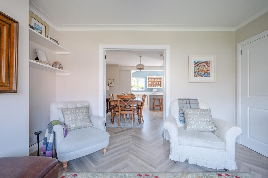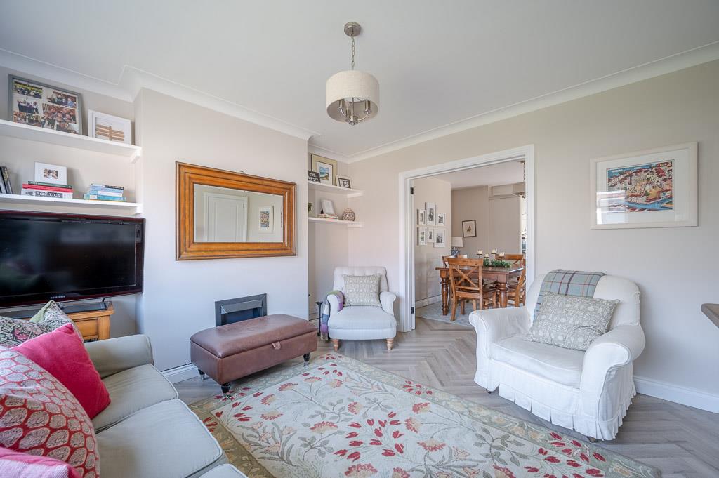 Drawing Room: - (3.91m x 3.63m) - Oak chevron laminate flooring, cornice ceiling, mature outlook to front, built-in book and display shelving either side of chimney breast, hole in wall electric fire, double doors to L-shaped kitchen/dining/living space.