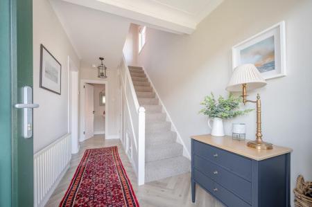 Spacious Reception Hall: - () - With oak laminate chevron flooring, cornice ceiling, excellent storage cupboard and cloaks under stairs.