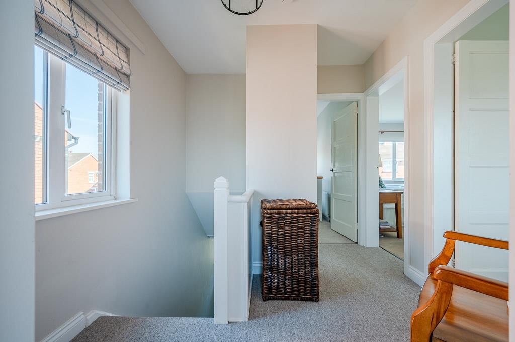 Spacious First Floor Landing: - () - With access hatch to roof space, linen press with radiator and built-in shelving and storage with Valiant gas fired boiler.
