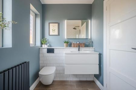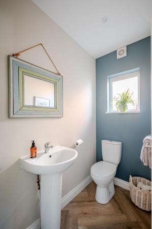 Ground Floor Wc And Cloakroom: - () - With white suite comprising low flush WC, pedestal wash hand basin, chrome mixer taps, oak chevron laminate flooring and ample cloaks area, recessed spotlighting, extractor fan.