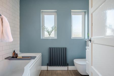 Bathroom: - () - Modern white suite comprising close coupled WC, floating vanity unit with twin drawer units below, matt black mixer taps, part subway tiled recess, illuminated mirror, P-shaped panelled bath, matt black mixer taps, shaped shower screen, fully subway style tiling with built-in matt black thermostatically controlled shower unit, overhead drencher and shower attachment, oak style porcelain tiled flooring, recessed LED spotlighting, extractor fan.