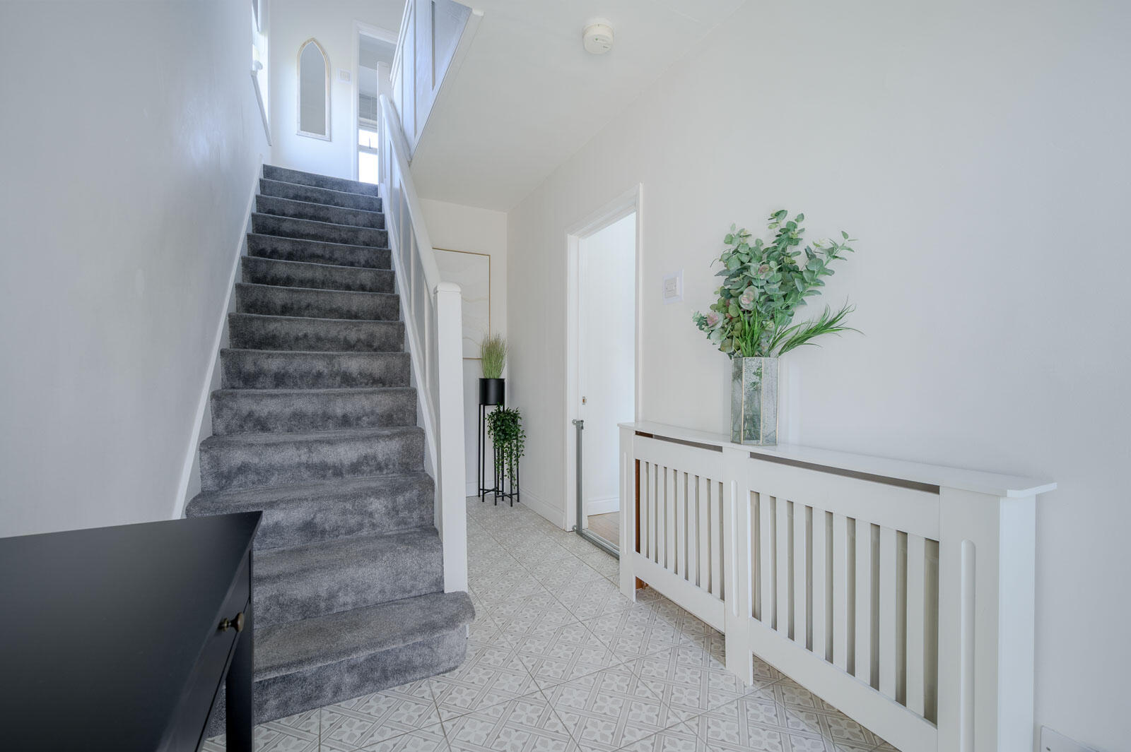 Tiled Entrance Hall: - Storage under stairs with fuse board and hanging space.