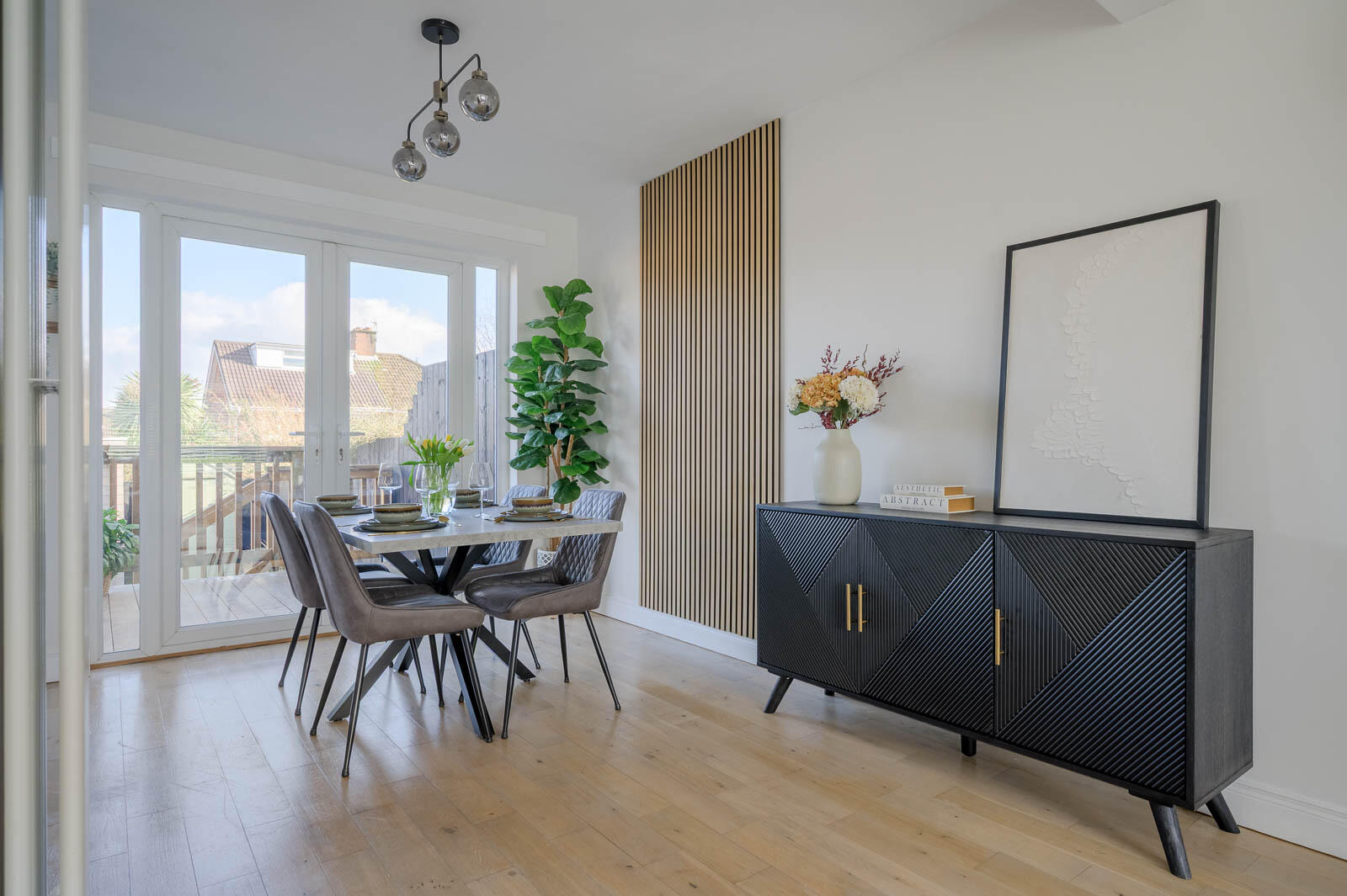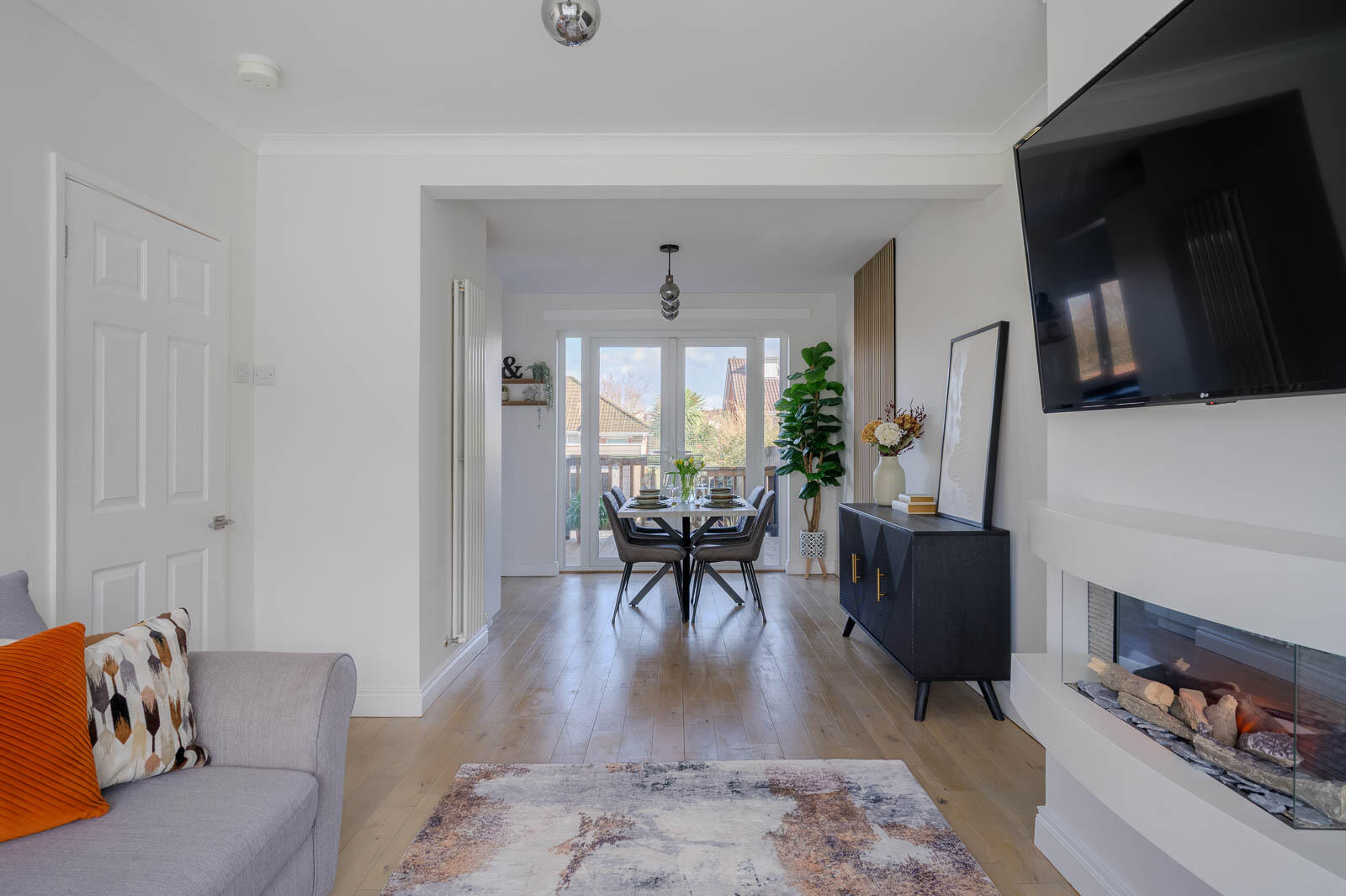 .Bright and spacious open-plan lounge/dining room, filled with natural light from large front and rear windows and enhanced by modern décor, wooden flooring and a contemporary media wall feature.