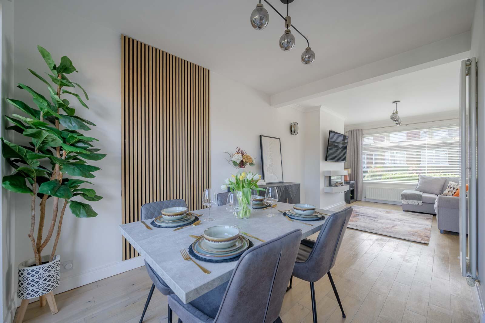The attractive red-brick façade and manicured front garden create immediate kerb appeal, while a welcoming entrance leads into a bright through-lounge/dining room. Flooded with natural light from dual aspect windows and enhanced by modern décor and a feature media wall, this space provides the ideal setting for relaxation and entertaining. The adjoining dining area offers ample room for family meals and opens seamlessly towards the rear of the home.