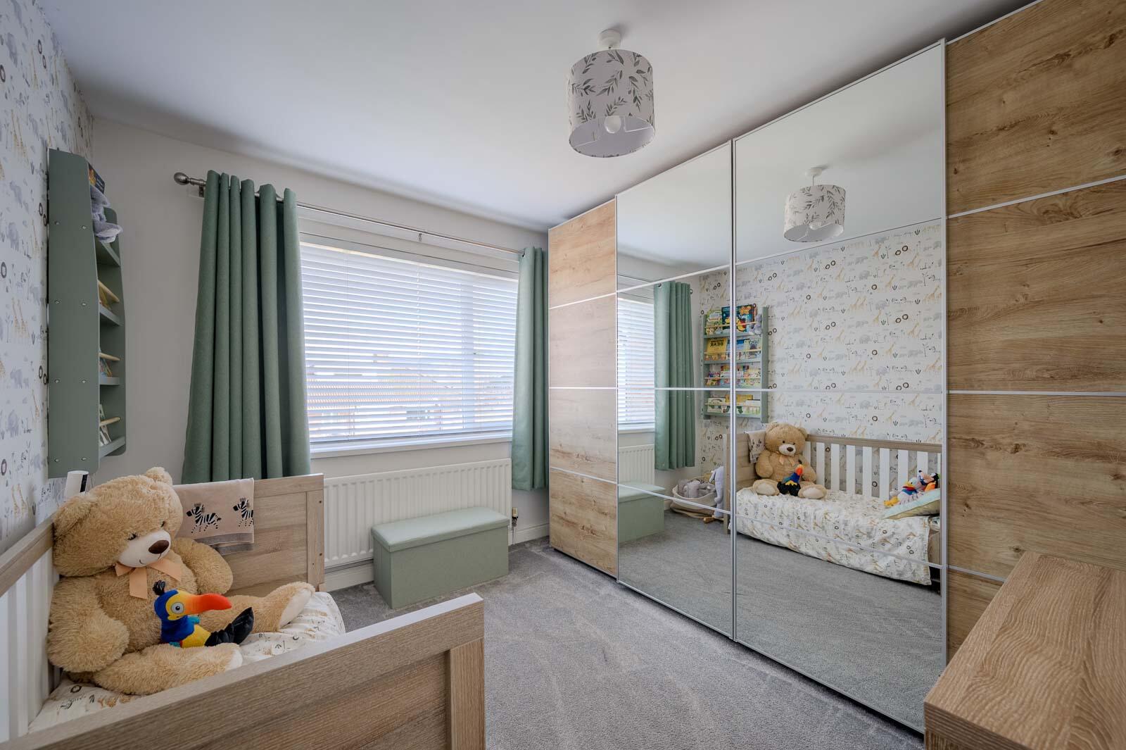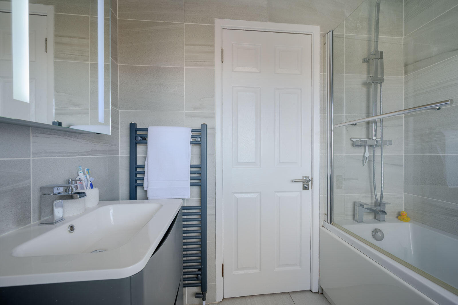 Upstairs, three beautifully presented bedrooms offer superb versatility. The principal bedroom boasts soft muted tones and stylish panelling, creating a calming retreat. A further double bedroom features built-in mirrored wardrobes, maximising space and light, while the third bedroom makes an ideal nursery, guest room or home office. The family bathroom has been finished to a high standard with elegant modern tiling, a bath with shower over and a crisp, contemporary suite.