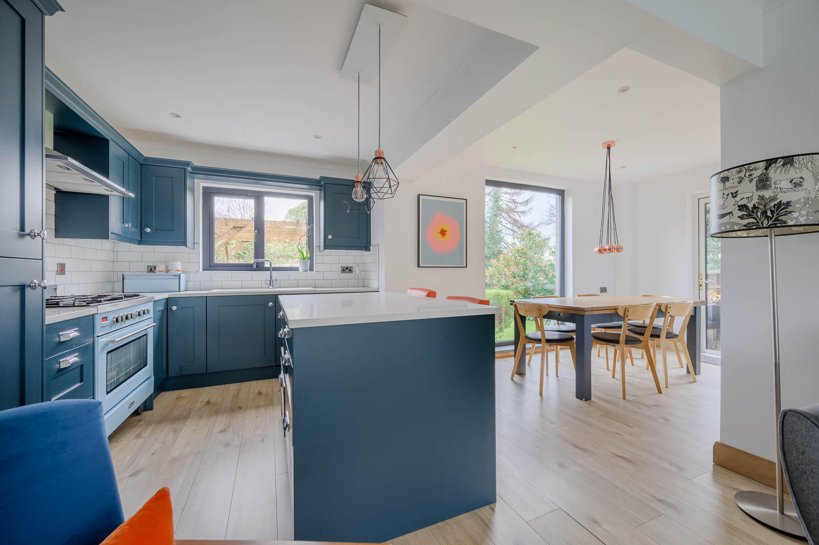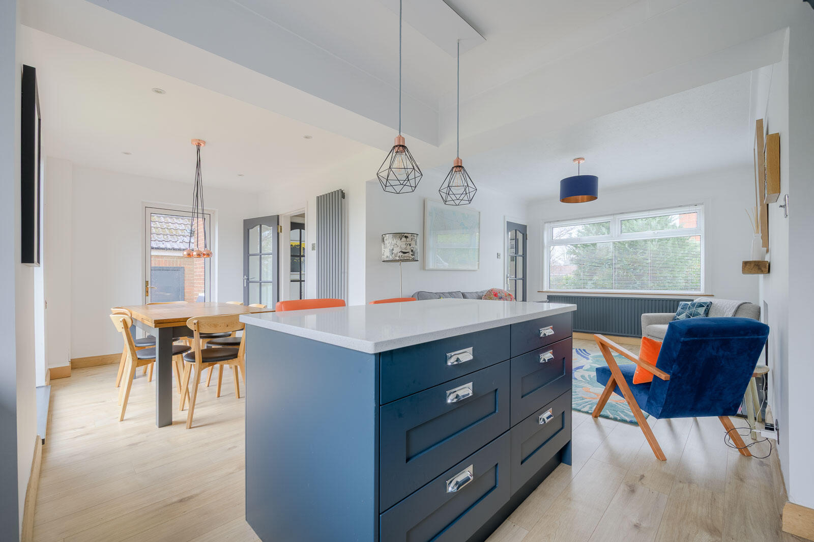 .Stunning open-plan kitchen, living and dining space, designed with modern family living in mind, boasting navy shaker cabinetry, high-quality appliances, central island and feature pendant lighting.