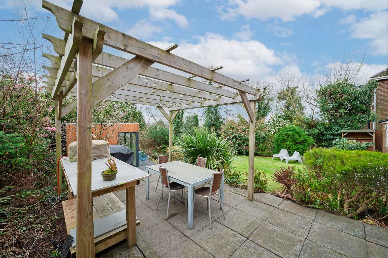 A pergola seating area and landscaped beds complete this impressive garden, creating a peaceful haven.