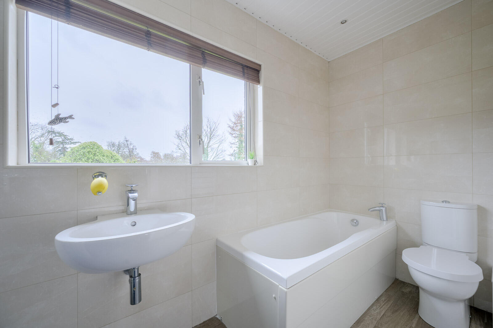 .Stylish family bathroom with modern tiling, separate shower enclosure, full bathtub and excellent natural light-both practical and luxurious.
