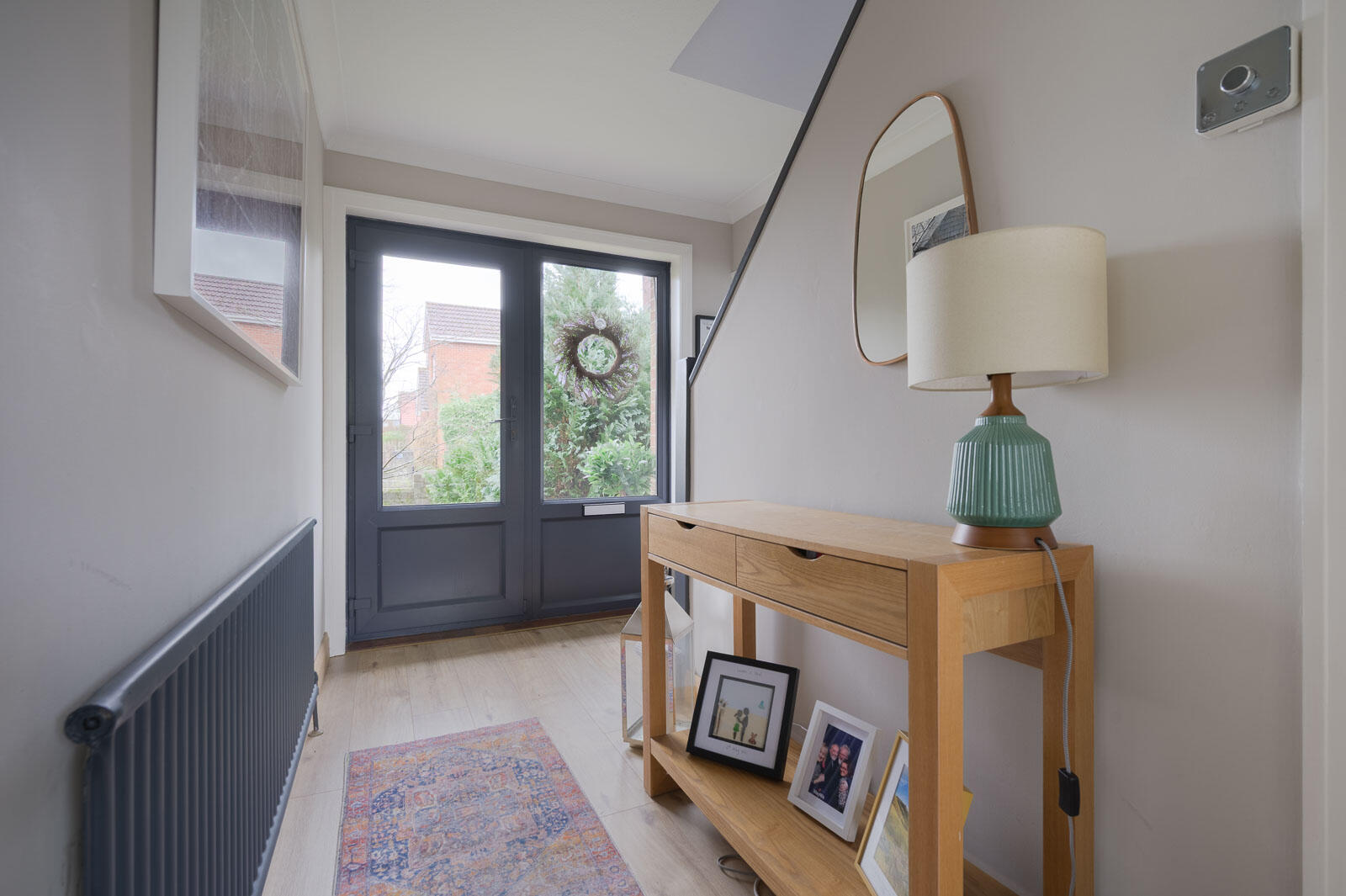 Spacious Entrance Hall: - With wood laminate flooring, Hive Home heating control, under stairs storage with light and hanging space.