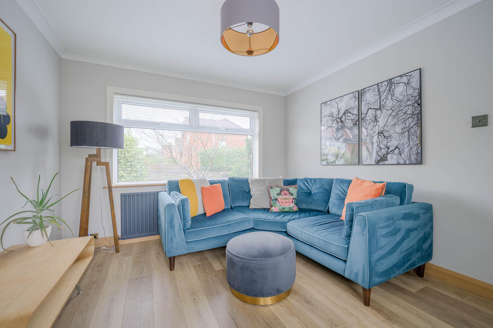 .Elegant front living room featuring large windows delivering superb natural light, crisp décor and a calm, welcoming ambience-perfect for relaxing or entertaining.