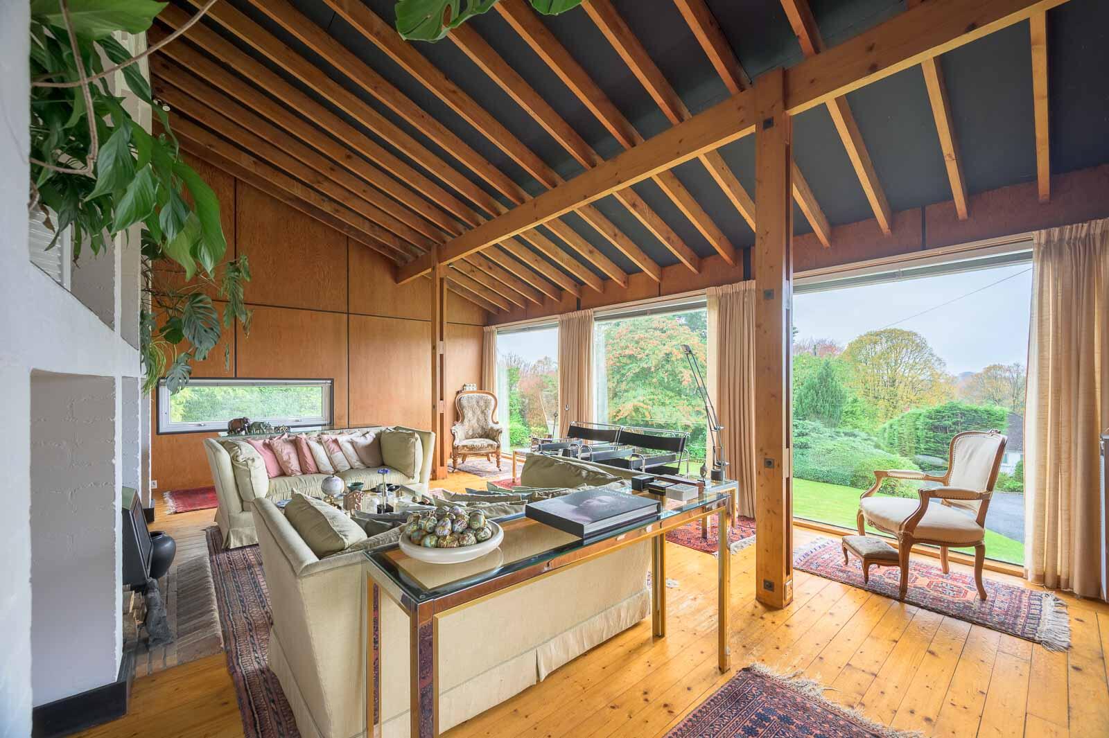 Stepped walkways lead to further reception areas, a spacious dining room, and a large kitchen with superb workspace and a pleasant garden aspect. The bedroom accommodation continues the home's architectural theme, with vaulted ceilings, warm timber detailing, and excellent natural light. Additional rooms offer flexibility for home working or quiet retreat.