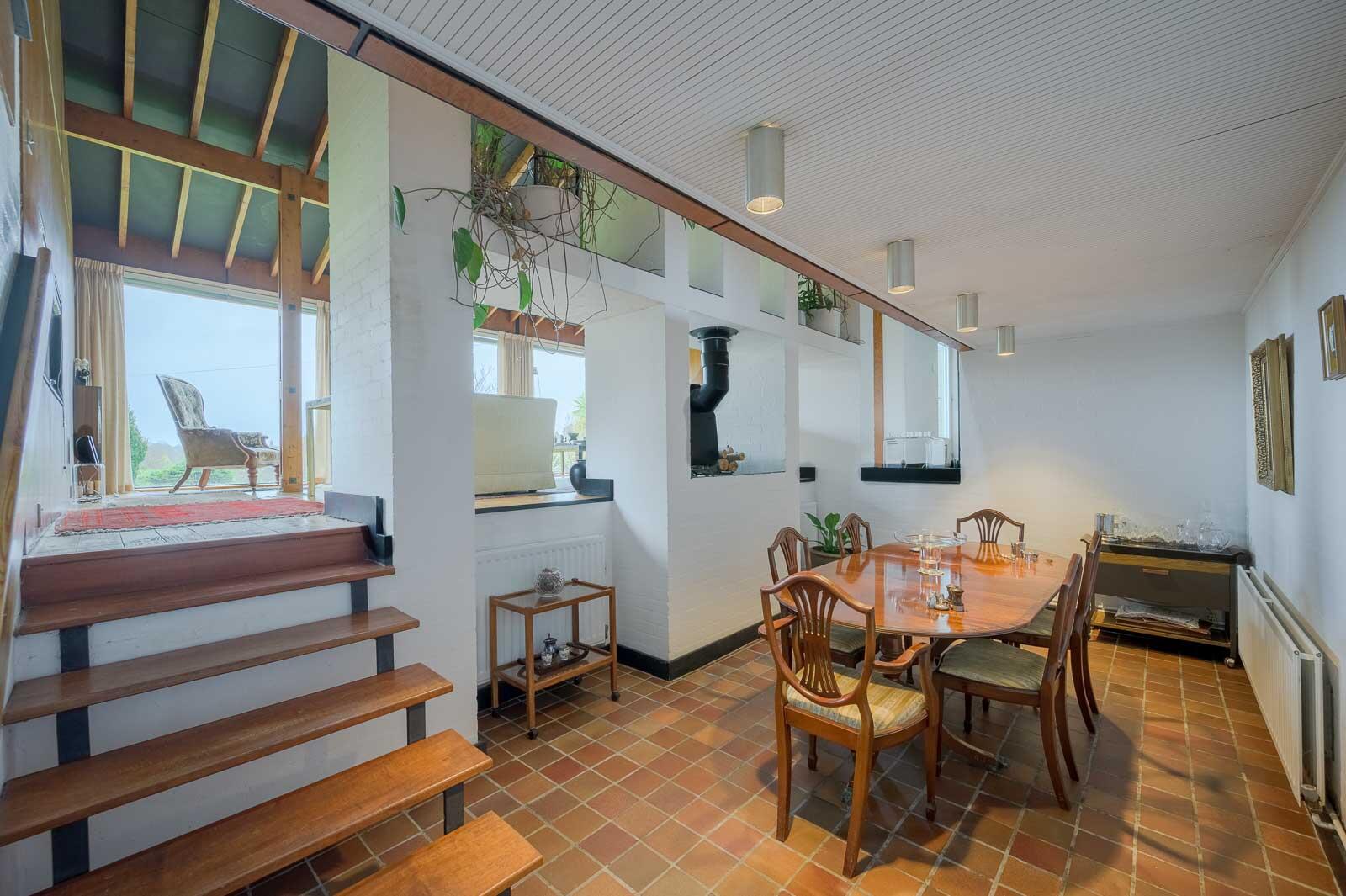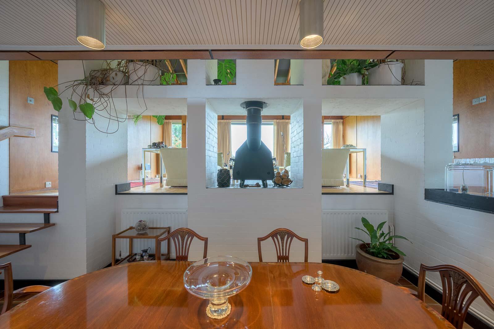 .Warm Mid-Century Materials Including Timber Panelling, White Brickwork, and Rich Tiled Floors Preserved to Highlight the Property's Architectural Integrity