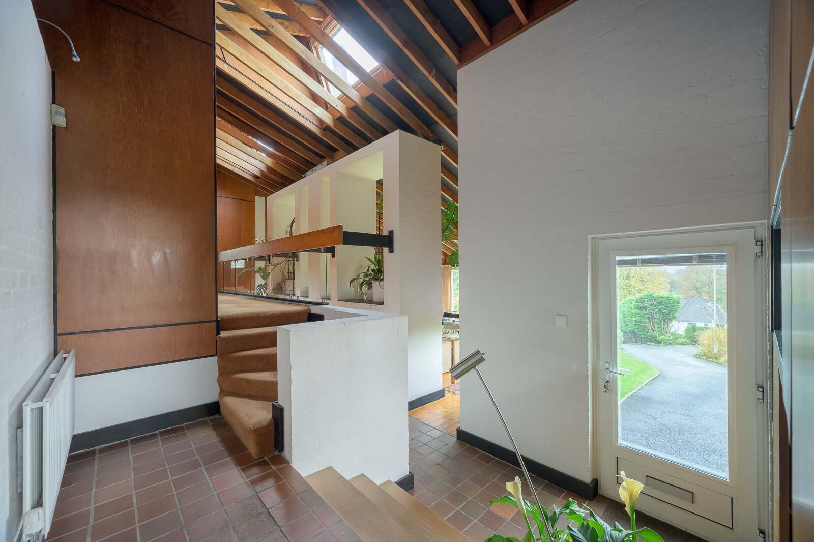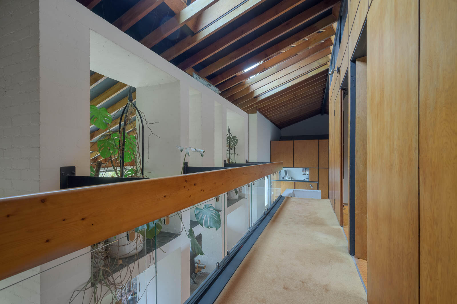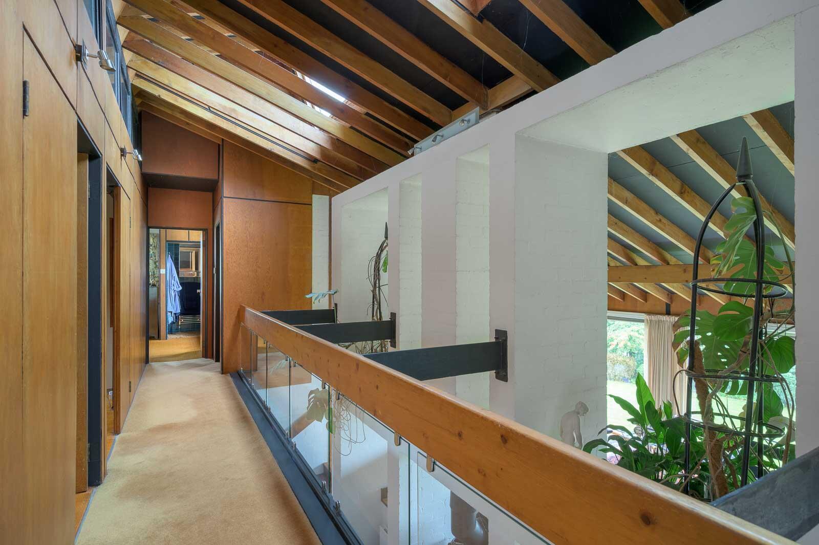 The elevated front façade with full-height windows sets the tone, revealing generous garden views and a bright, open main living area. Inside, the home unfolds across a series of split levels, creating dynamic sightlines and a wonderfully interconnected layout. Timber panelling, exposed beams, sculptural feature walls, and white brickwork contribute to the home's unmistakable mid-century character, which is showcased to great effect in the principal lounge - an inviting space with double-height elements, a striking fireplace, and panoramic garden outlooks.