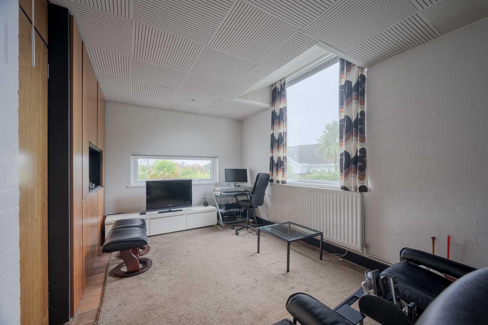 Family Room / Bedroom Four: - 16'2" x 9'0" - With dual aspect outlook, mature outlook to side and fabulous mature elevated outlook across East Belfast to the Castlereagh Hills, built-in cabinetry with excellent storage and outlook into reception hall, built-in wardrobe storage, plumbed for washing machine, ideal as family room or fourth bedroom, Heather Brown tiled floor, with outlook through drawing room.