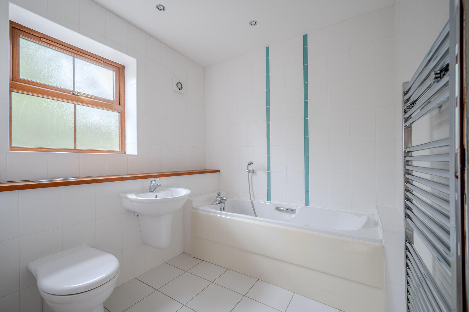 Bathroom: - White suite comprising: low flush WC, floating wash hand basin with chrome mixer taps, panelled bath, fully tiled walls, tiled floor, extractor fan, chrome heated towel rail.