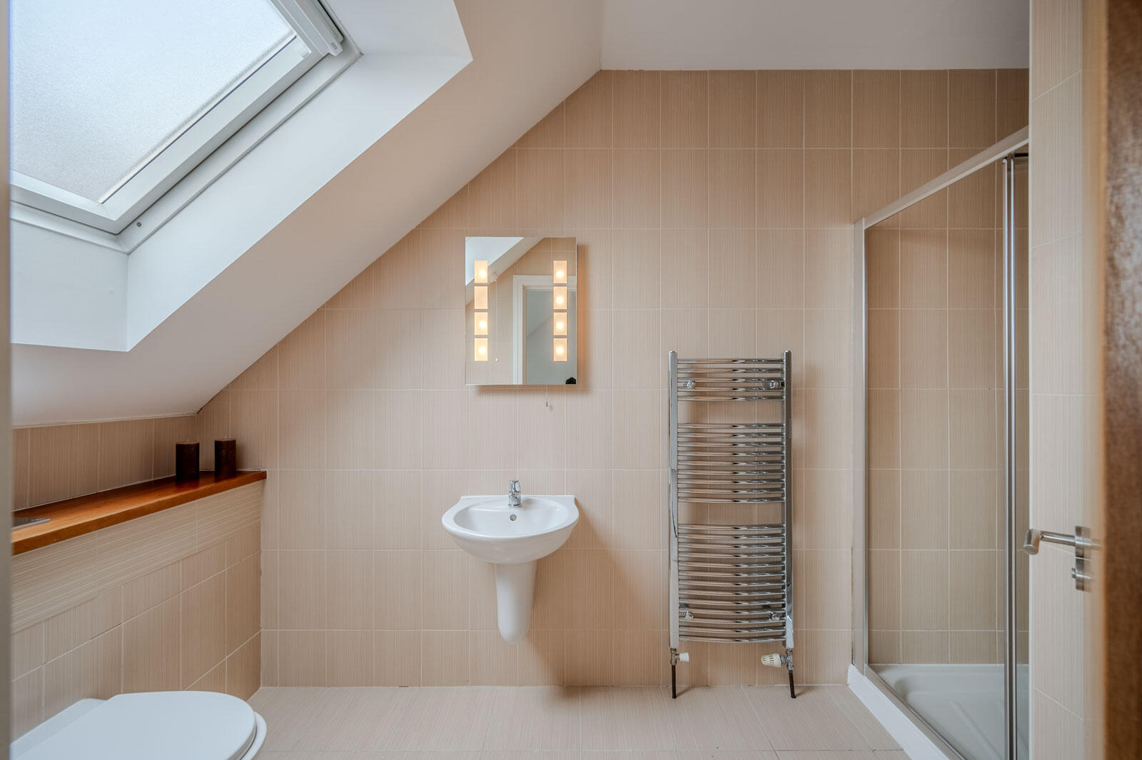 En Suite - White suite comprising: close coupled WC, floating wash hand basin with chrome mixer taps, chrome heated towel rail, built-in shower cubicle with shower unit, fully tiled walls, ceramic tiled floor, Velux window, mirror recess with light.
