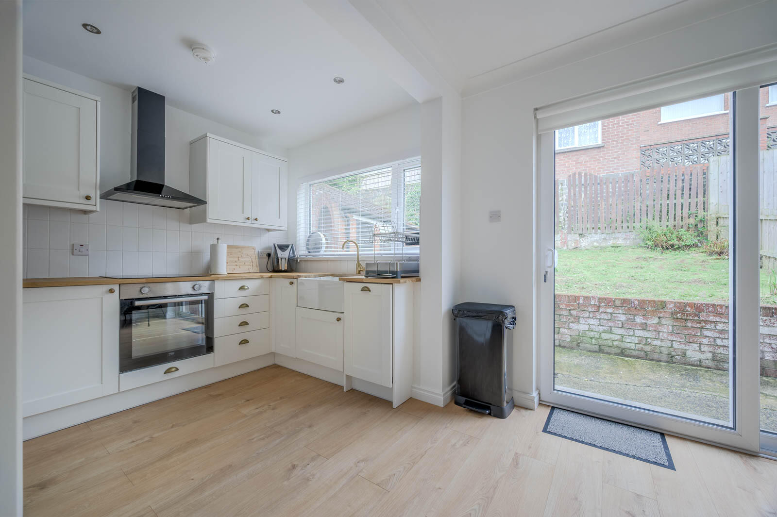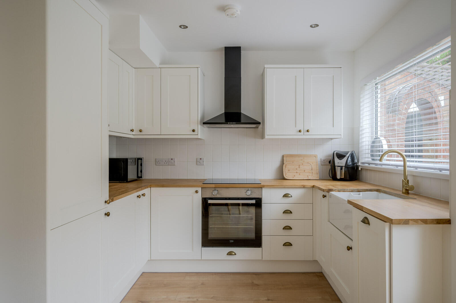 Kitchen: - 9'5" x 7'4" - Kitchen with excellent range of high and low level units, brushed brass fittings, wood effect laminate worktop, Belfast ceramic sink and brushed brass mixer tap, integrated fridge freezer, integrated dishwasher, built-in low level oven, four ring ceramic hob, extractor hood above, part tiled walls, low voltage recessed spotlighting, laminate wooden floor, vertical radiator x two, uPVC double glazed sliding door to rear garden.
