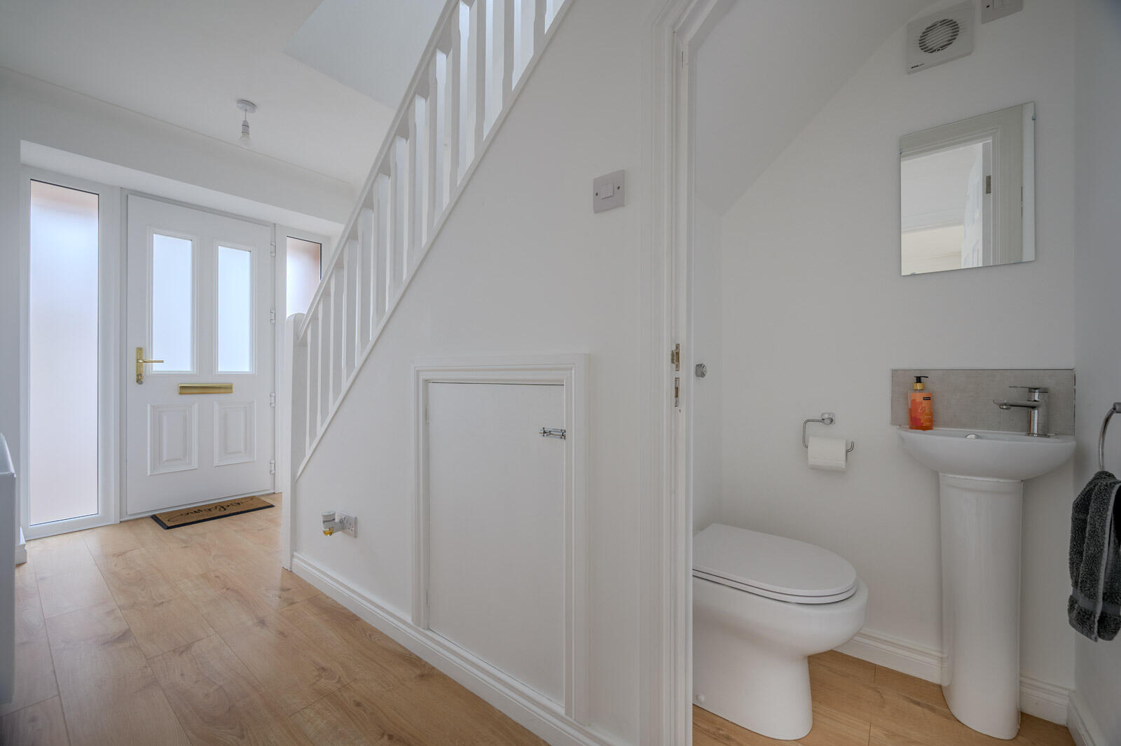 Downstairs Wc: - White suite comprising close coupled WC with push button, pedestal wash hand basin and chrome mixer tap, tiled splashback, laminate wooden floor, low voltage recessed spotlighting, extractor fan.