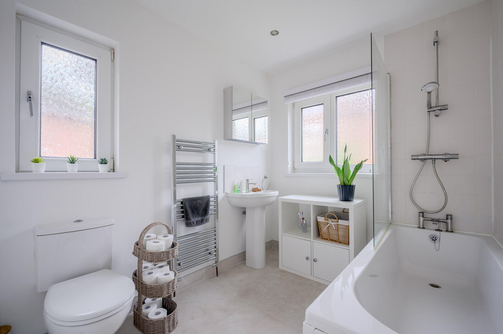 Family Bathroom: - Modern white suite comprising low flush WC with push button, pedestal wash hand basin with chrome mixer taps, tiled splashback, fully panelled bathtub, part tiled walls, chrome mixer taps, thermostatically controlled valve and telephone hand unit, porcelain tiled floor, frosted glass window, low voltage recessed spotlighting, extractor fan, chrome heated towel rail.