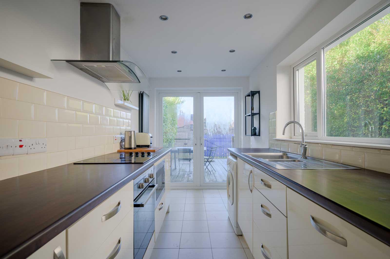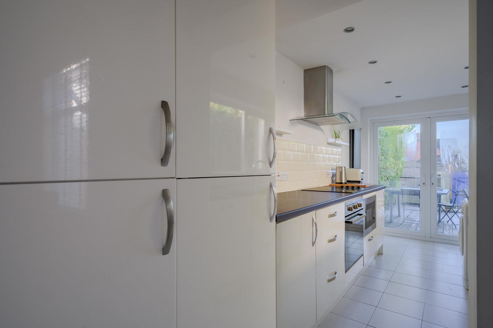 The modern kitchen is fitted with sleek high gloss cabinetry, integrated appliances, and ample worktop space. French doors open directly onto a private rear garden with a decked patio area, perfect for outdoor dining and enjoying the sunshine.