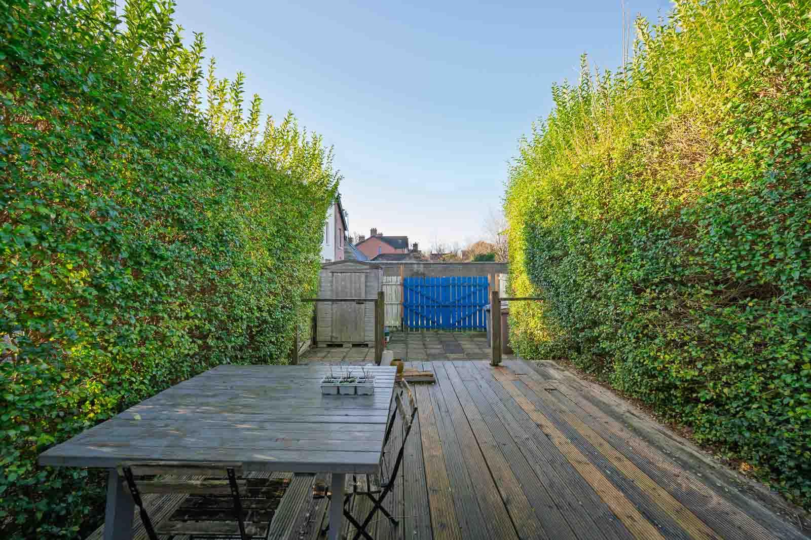 .Enclosed Rear Garden with Timber Decking and Mature Hedging Ensuring Privacy and a Low-Maintenance Outdoor Space