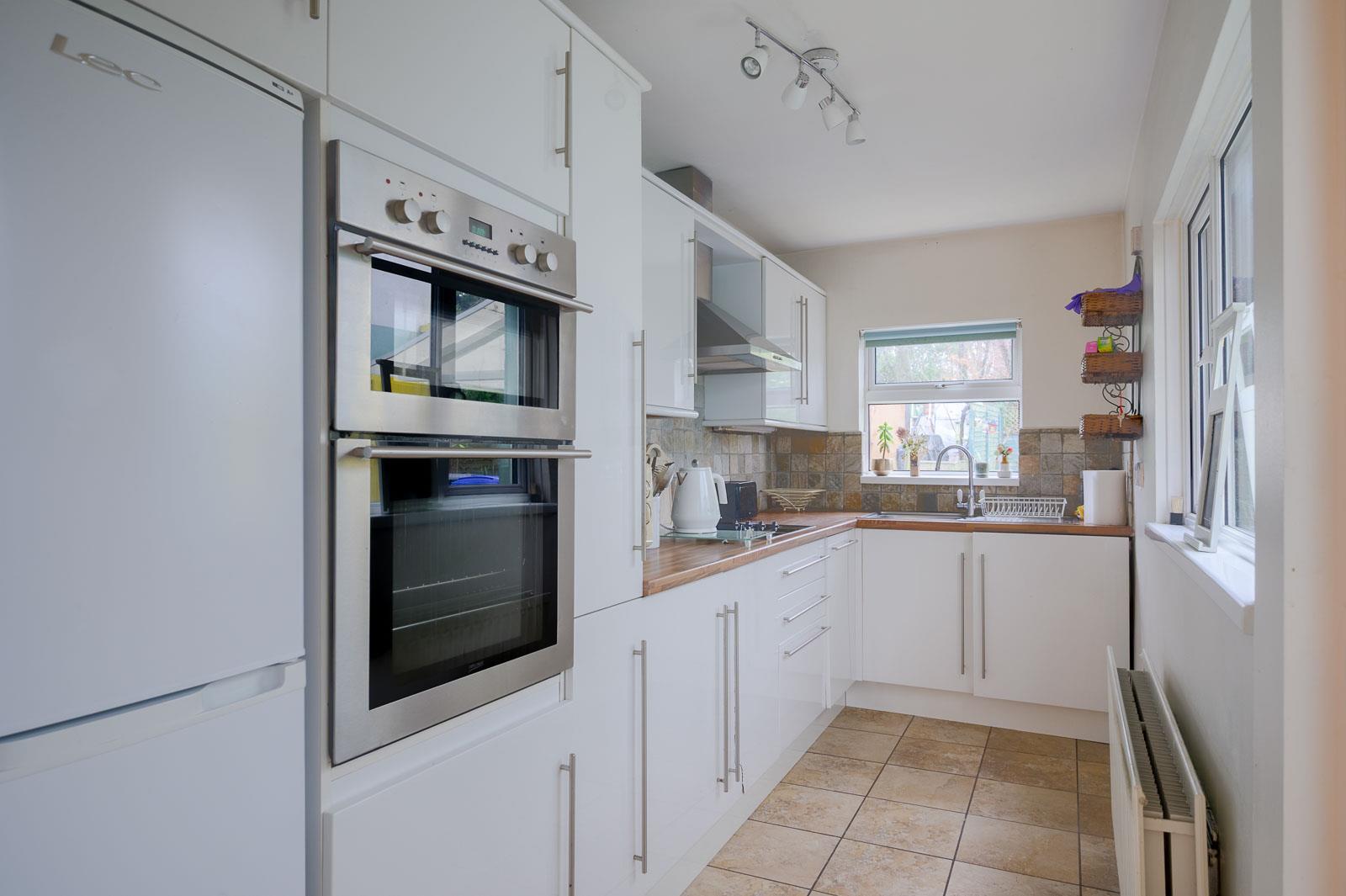 The modern kitchen is thoughtfully designed with sleek white high gloss cabinetry, integrated double oven, and tiled flooring, providing both style and functionality. Upstairs, the property offers two comfortable bedrooms, including a master with a striking bay window and concealed storage. The family bathroom is finished to a high standard with neutral tiling, a full-size bath, and a separate shower enclosure.