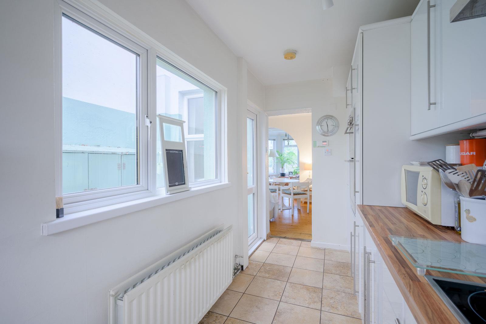 Modern Fitted Kitchen: - 15'1" x 6'8" - With range of high and low level white high gloss units, laminate worktop, stainless steel sink unit, ceramic hob, stainless steel extractor fan, integrated slimline dishwasher, integrated washing machine, integrated eye level double oven, fridge freezer space, PVC double glazed back door, tiled floor, part tiled walls.