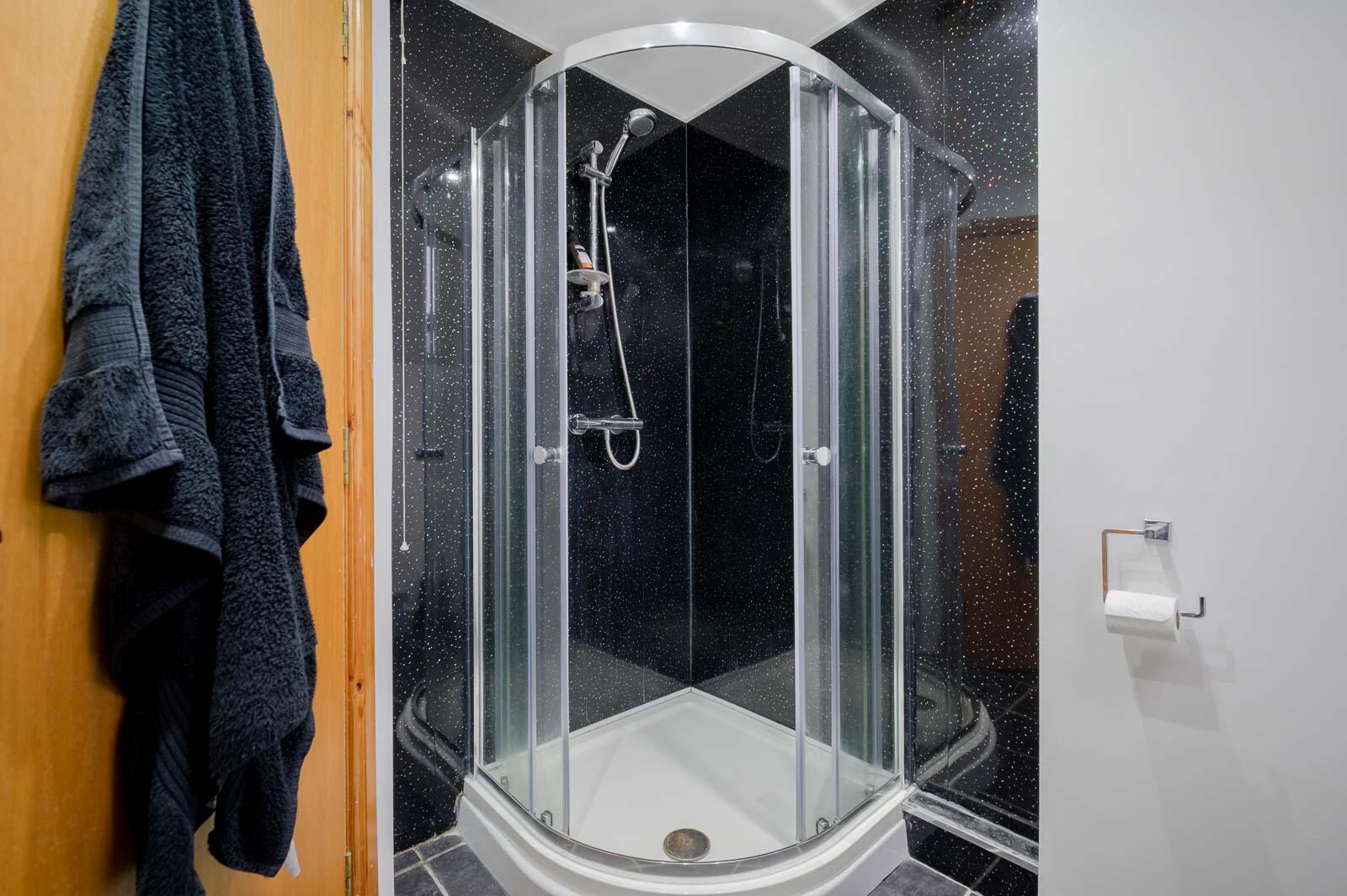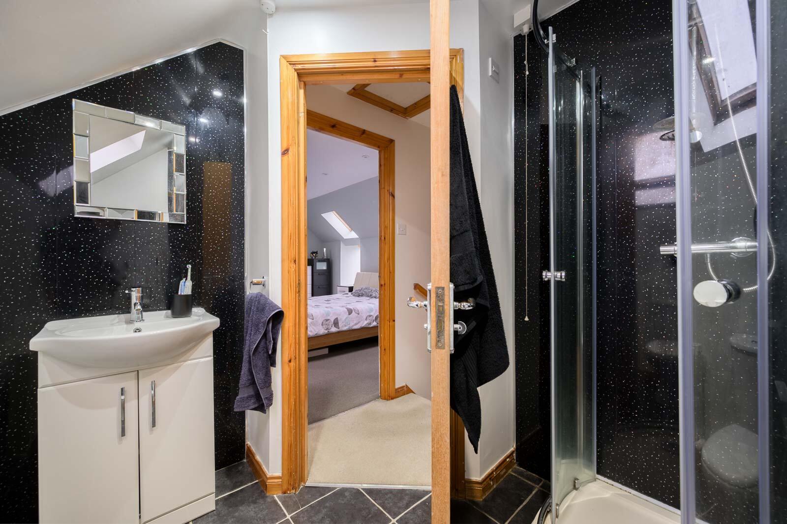 Shower Room: - White suite comprising panelled shower cubicle, thermostatic shower, vanity unit with basin and chrome mixer tap, low flush WC, tiled floor.