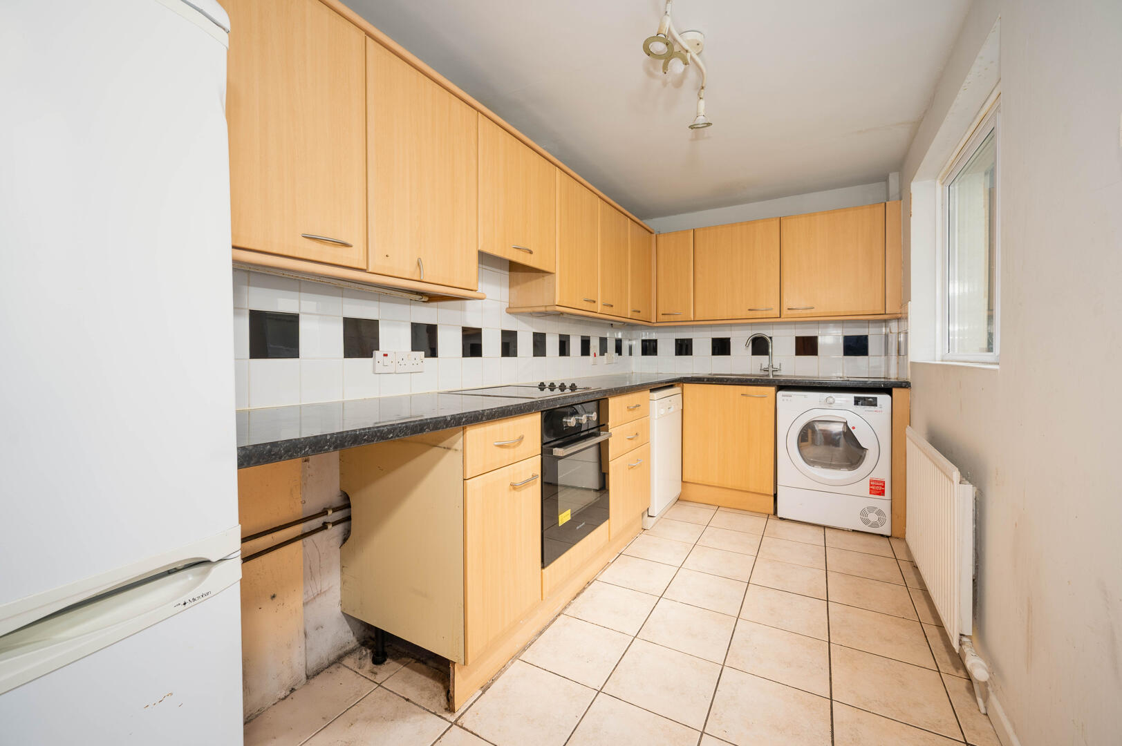 Kitchen: - 14'3" x 6'4" - With excellent range of high- and low-level units, stainless steel fittings, laminate worktop, stainless steel sink and chrome mixer tap, built-in low-level oven, four ring electric hob, extractor hood above, plumbed for washing machine, plumbed for dishwasher, space for fridge freezer, ceramic tiled floor, outlook to rear, uPVC double glazed access door to rear yard.
