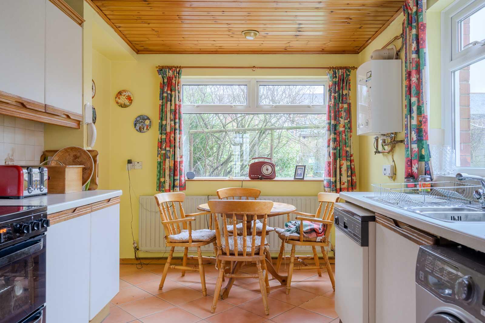 The extended kitchen is positioned to the rear of the property and enjoys pleasant views over the garden. With ample worktop space, good storage, and room for a dining table, it is practical for family use while offering clear potential for a contemporary redesign.