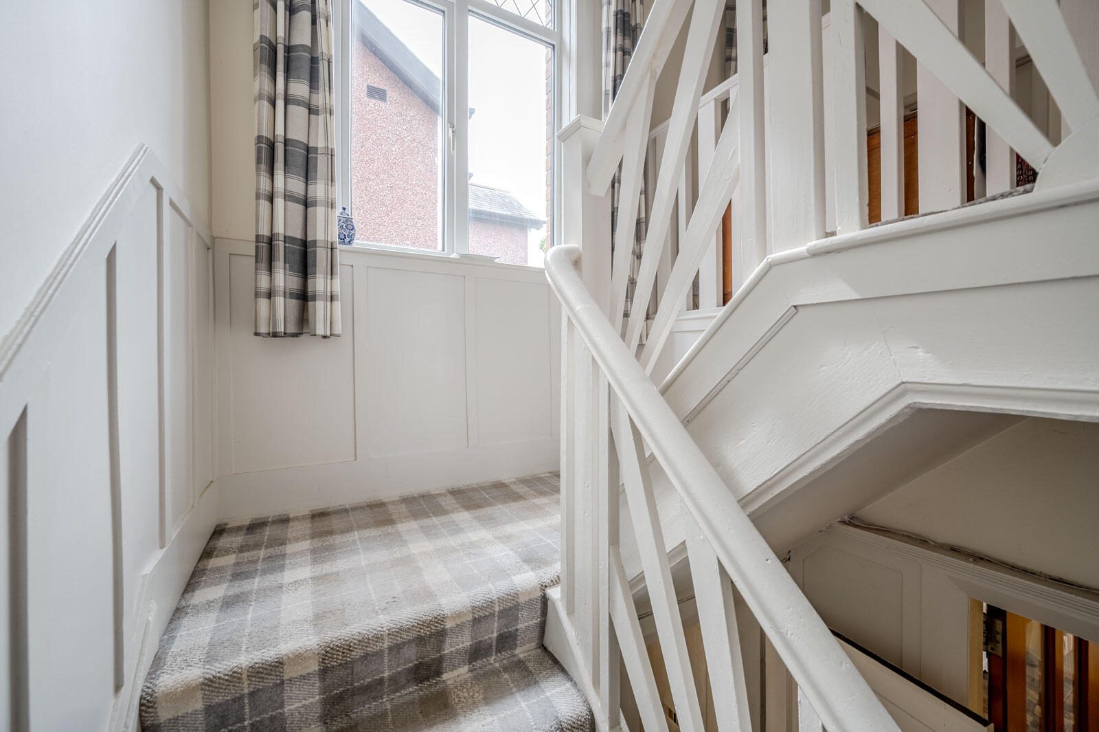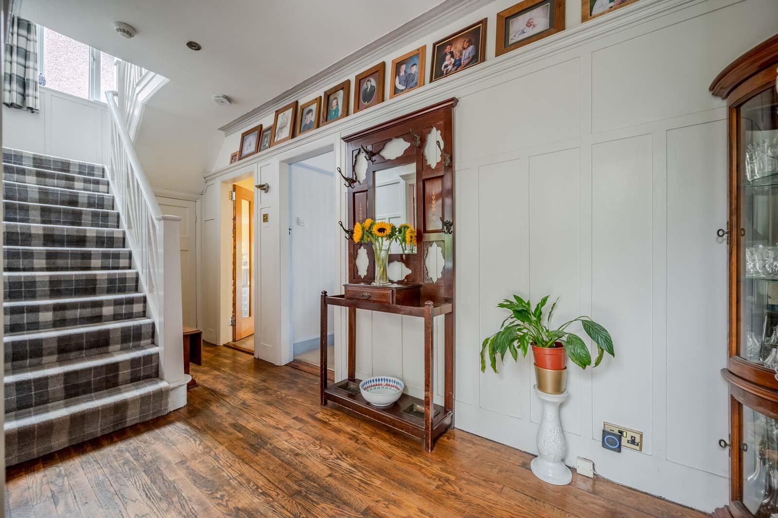 Spacious Reception Hall: - With solid wood flooring, cornice ceiling, wood panelled walls, storage under stairs, and part wood panelled walls to first floor landing with picture window on the return.