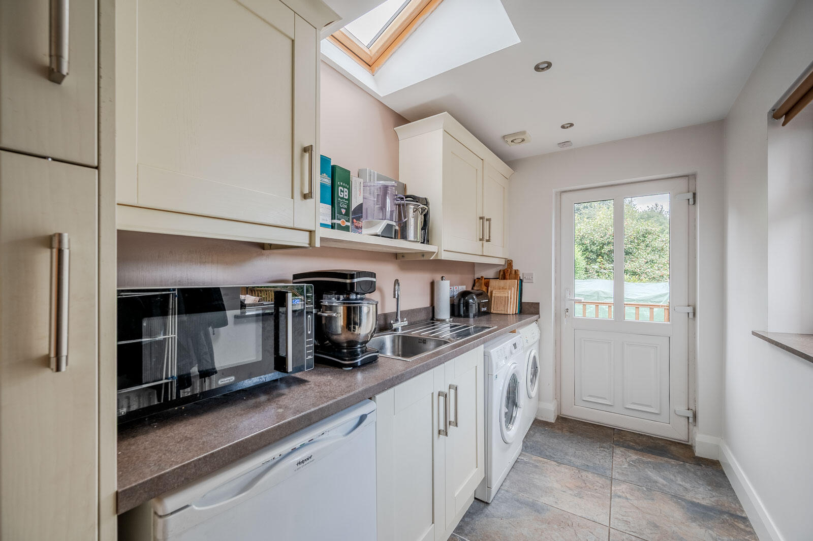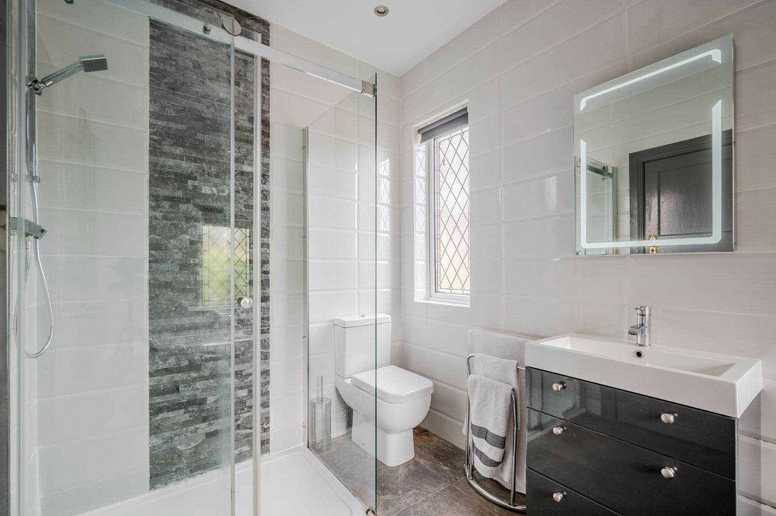 Shower Room: - White suite comprising tiled shower cubicle, electric shower, low flush wc, vanity unit, chrome mixer taps, storage cupboard with shelving, chrome heated towel rail, velux window, tiled walls and floor.