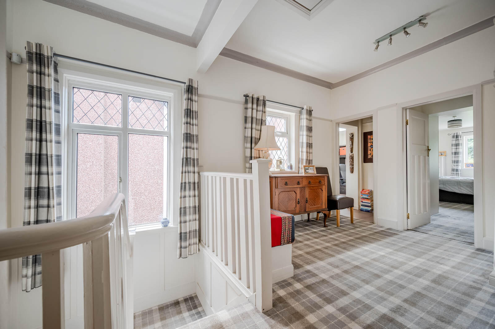 Gallery Landing: - Access to part floored roofspace via pull down wooden ladder, storage cupboard with pressurised water system cylinder.