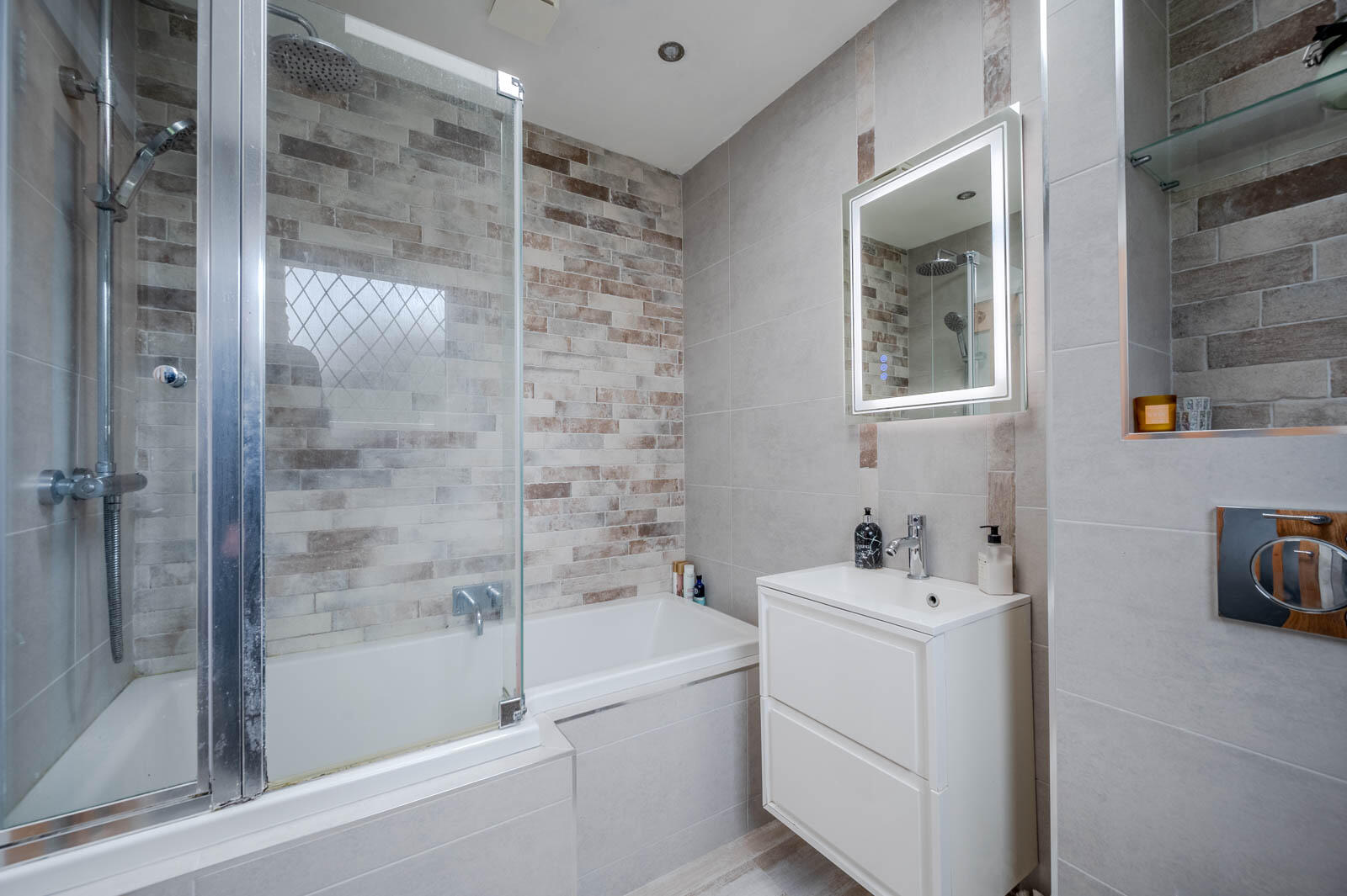 Contemporary Fitted Bathroom: - With white suite comprising freestanding bath, chrome mixer tap, vanity unit with drawers, chrome mixer tap, LED mirror, heated towel rail, shower cubicle with thermostatic shower, tiled walls, tiled floor.