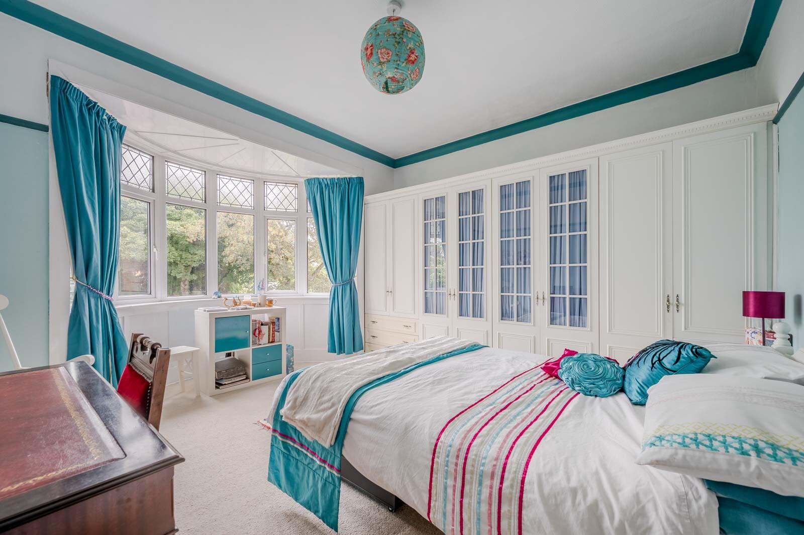 Bedroom Two: - 14'9" x 13'4" - Measurements into bow window. With mature outlook to front, picture rail, cornice ceiling, range of built in wardrobes.