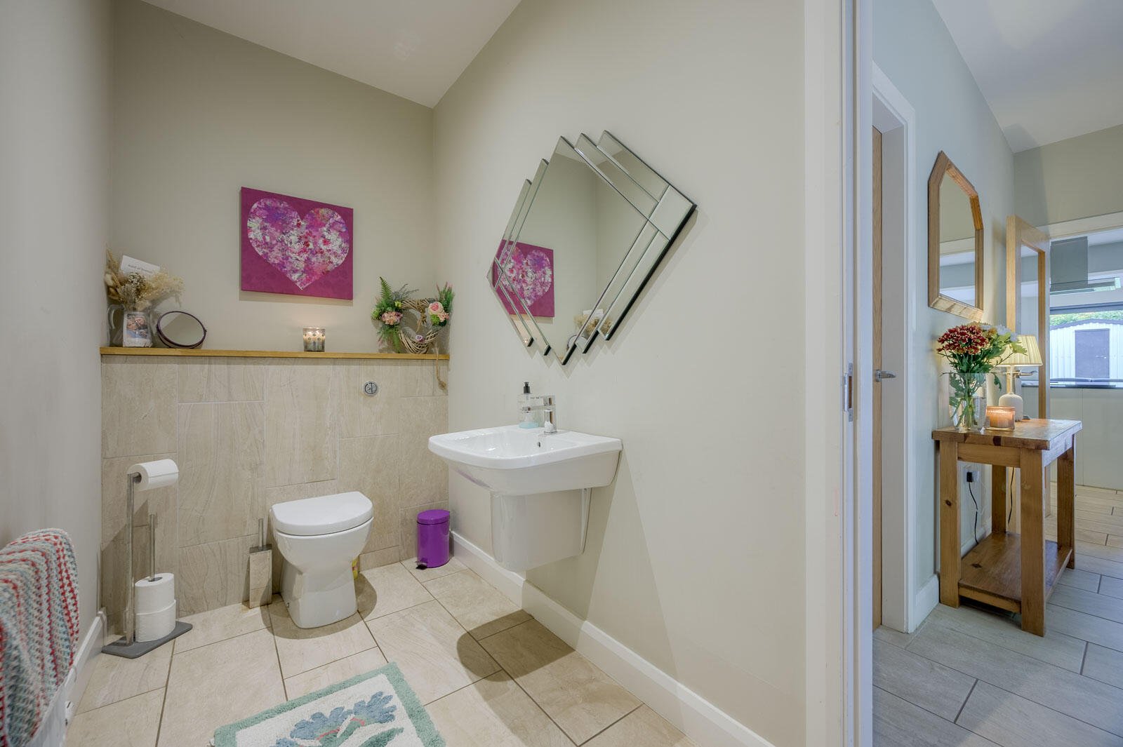 Downstairs Wc: - Semi pedestal wash hand basin, wall mounted wc, half tiled wall, ceramic tiled floor.
