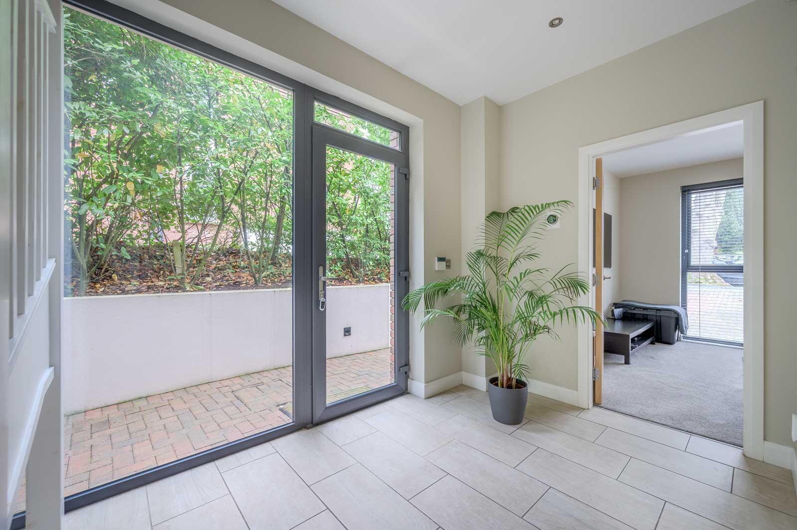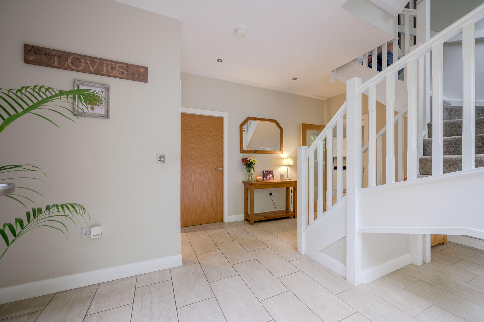 Entrance - Brick paved pathway to side leading to aluminium double-glazed door with full length glass panels to side and top light into bright spacious entrance hall.